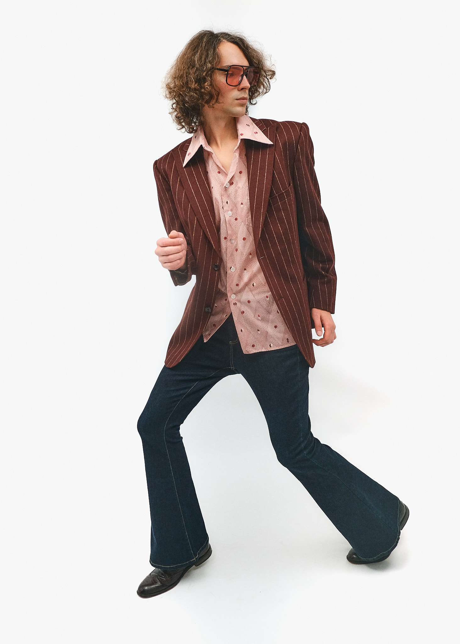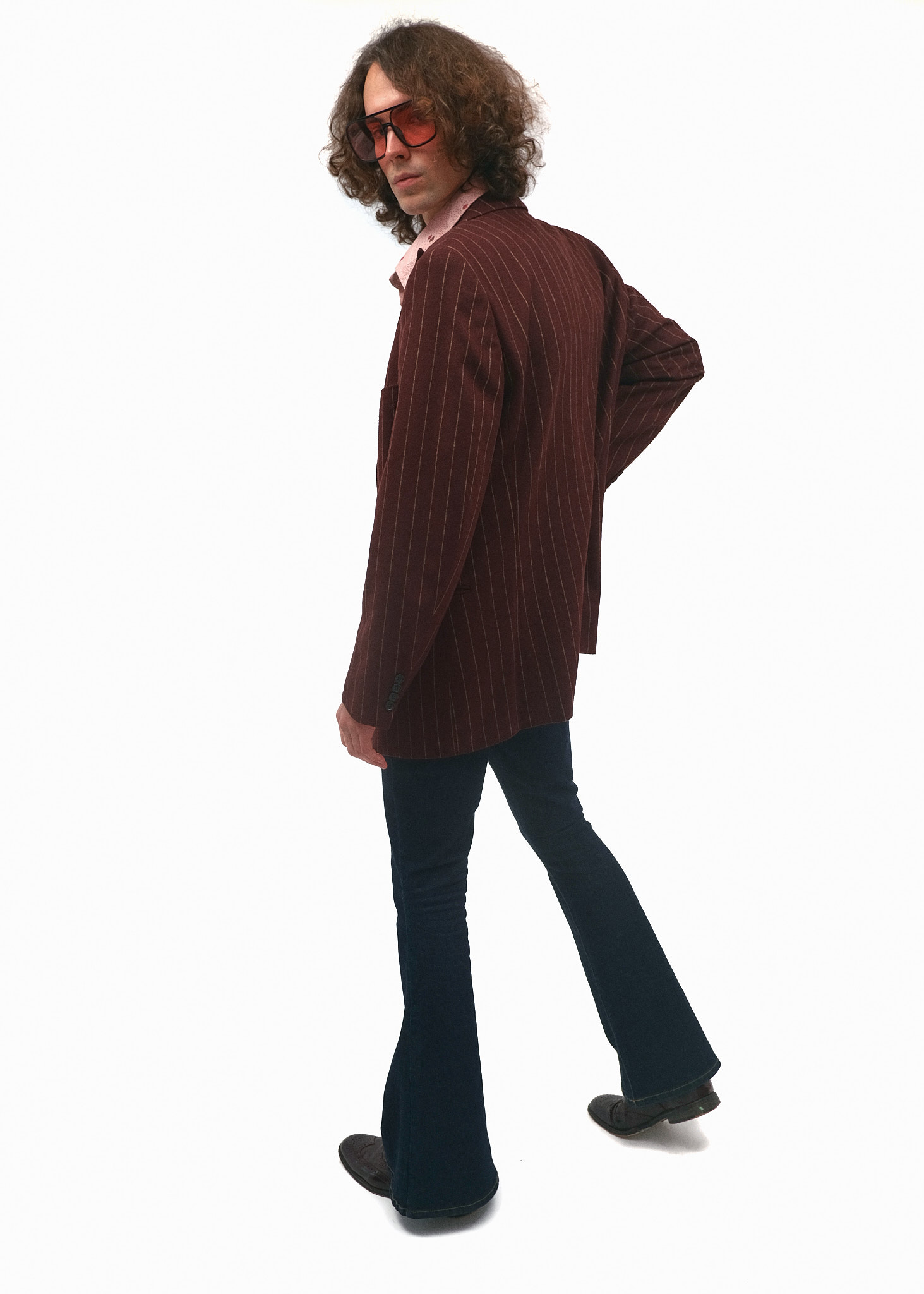 Елегантний повсякденний образ, що базується на поєднанні класичного крою та сміливих ретро-акцентів. Використання вертикальних смуг, широких лацканів та характерного кльошу створює динамічний силует впевненого в собі інтелектуала.