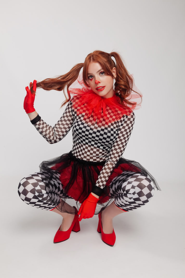Макіяж та зачіска: Традиційний грим Арлекіна з червоним носом та акцентом під оком у формі сльози. Зачіска у вигляді двох високих грайливих хвостів підкреслює бешкетний характер персонажа.