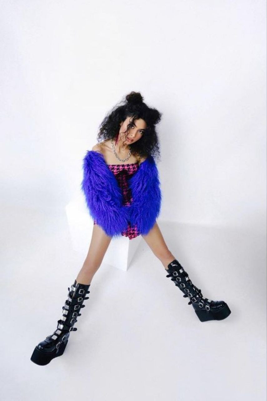 Деталі: Масивний сріблястий ланцюг на шиї та пишна зачіска з дрібними кучерями підкреслюють еклектичність та бунтарський дух луку.