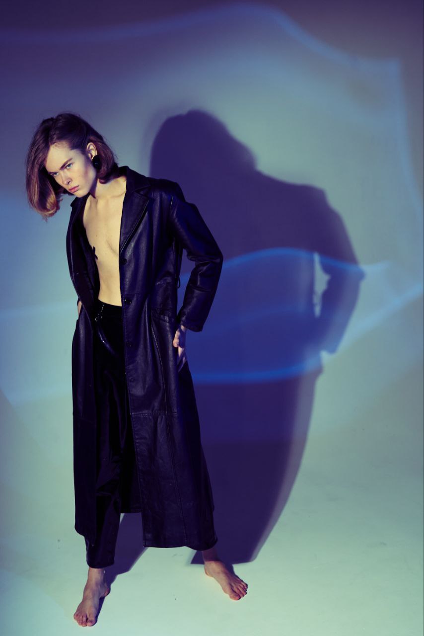 Драматичний та футуристичний образ, побудований на грі тіней та глянцевих фактур. Це втілення естетики андрогінності та кіберпанку, де мінімалізм межує з бунтарством. Використання лакованих матеріалів у поєднанні з голим тілом створює гострий, провокаційний силует, ідеальний для концептуальних фешн-зйомок з контрастним освітленням.
