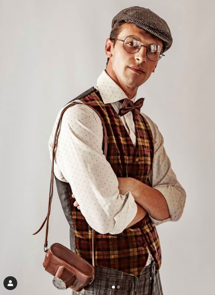 Аксесуари: Круглі окуляри в тонкій оправі та вінтажна фотокамера в шкіряному чохлі на ремінці, що завершують рольову модель професійного репортера початку XX століття.