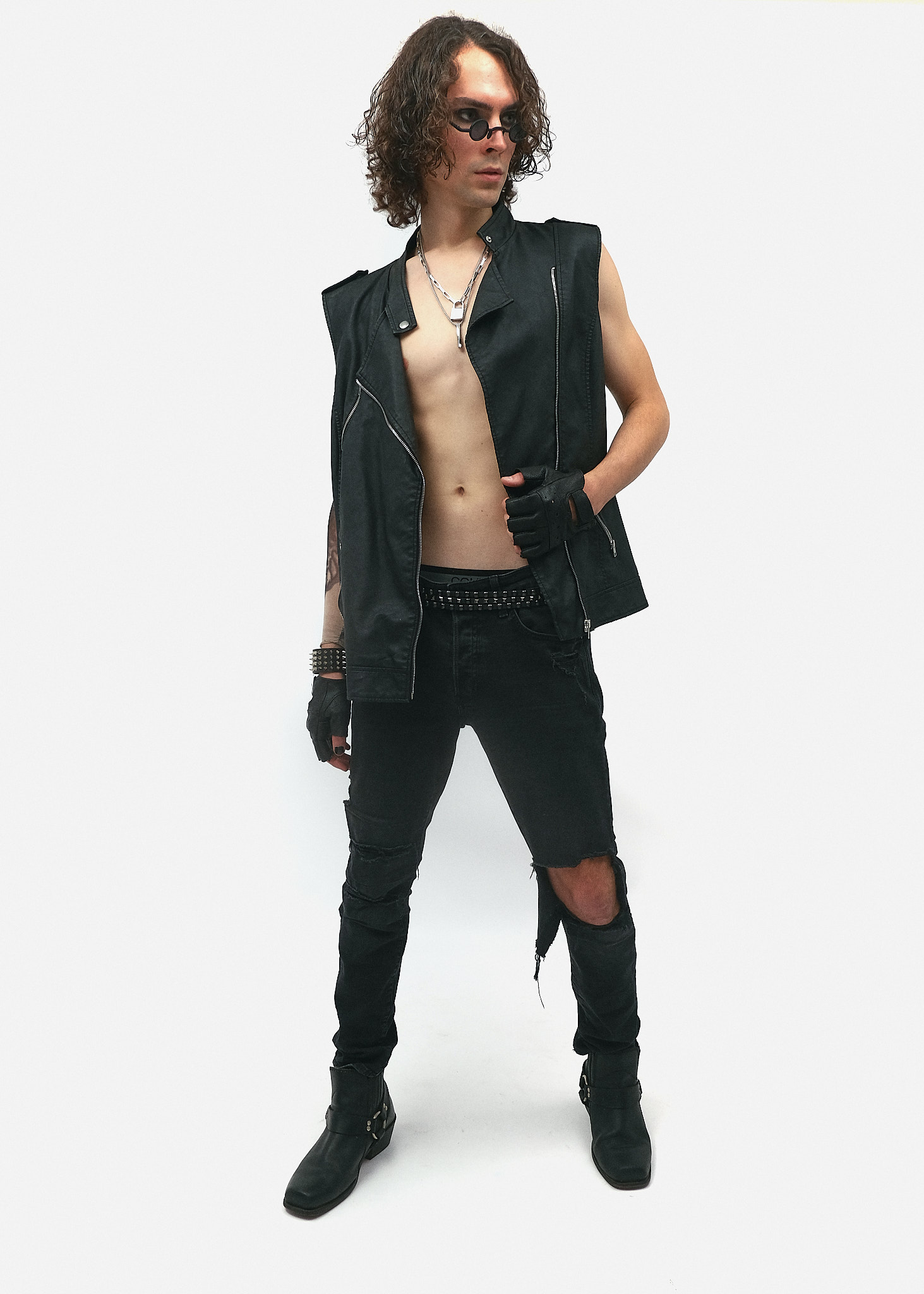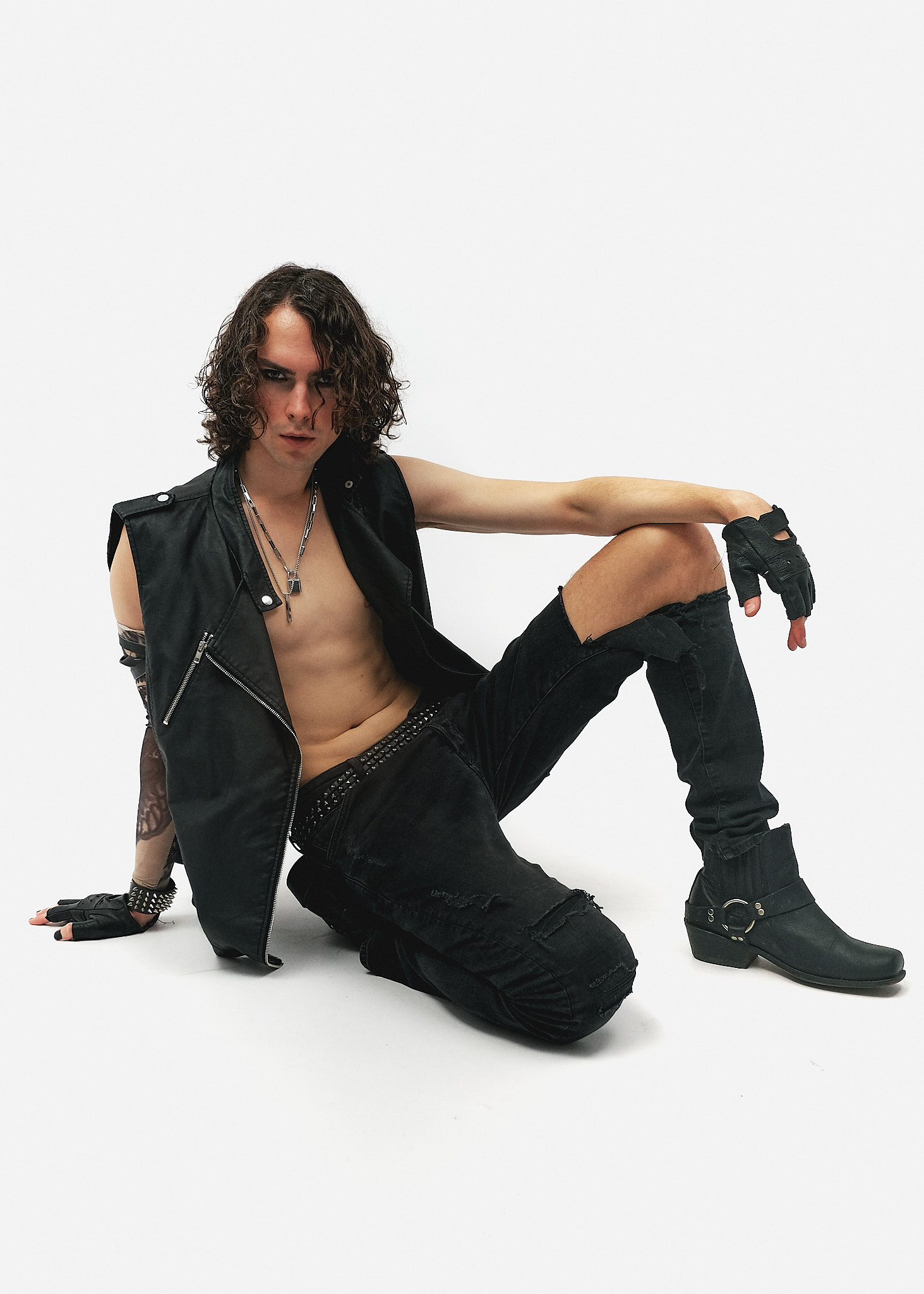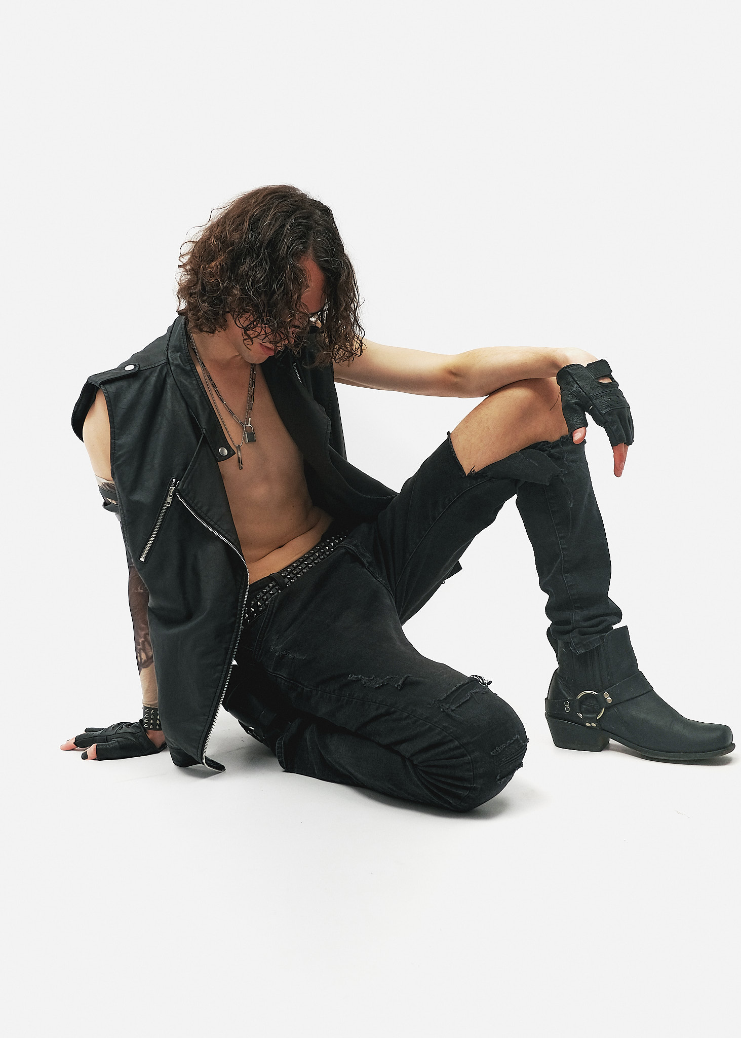 Мінімалістичний, але безкомпромісний образ у стилі "pure rock". Лук побудований на естетиці деструкції та сирої енергії вуличного протесту. Поєднання радикально рваного деніму, відкритого тіла та гострих металевих акцентів створює силует сучасного "нічного мешканця" мегаполіса. Це вибір для тих, хто відкидає зайвий декор на користь функціональної грубості та чітких ліній, де кожна деталь — від мікро-окулярів до замка на шиї — працює на створення образу зухвалого одинака.