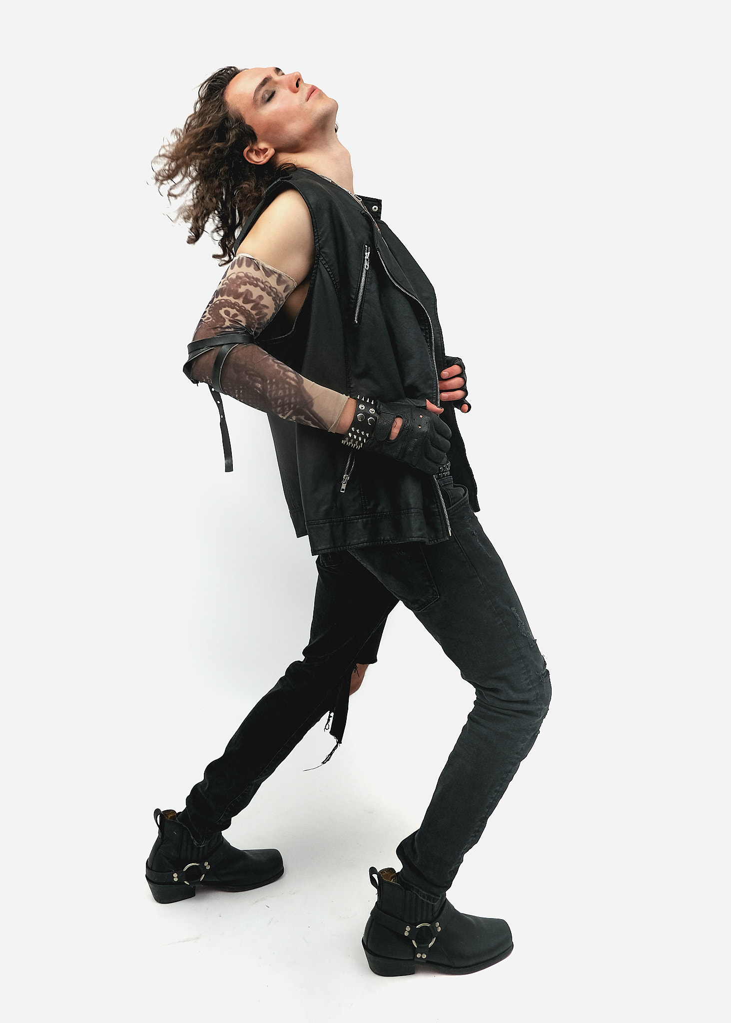 Шкіряний жилет-косуха: Безрукавка з м'якої чорної шкіри з діагональною блискавкою та високим коміром. Відсутність рукавів акцентує увагу на лініях плечей та татуюваннях, додаючи образу візуальної легкості при загальній важкості матеріалів.
