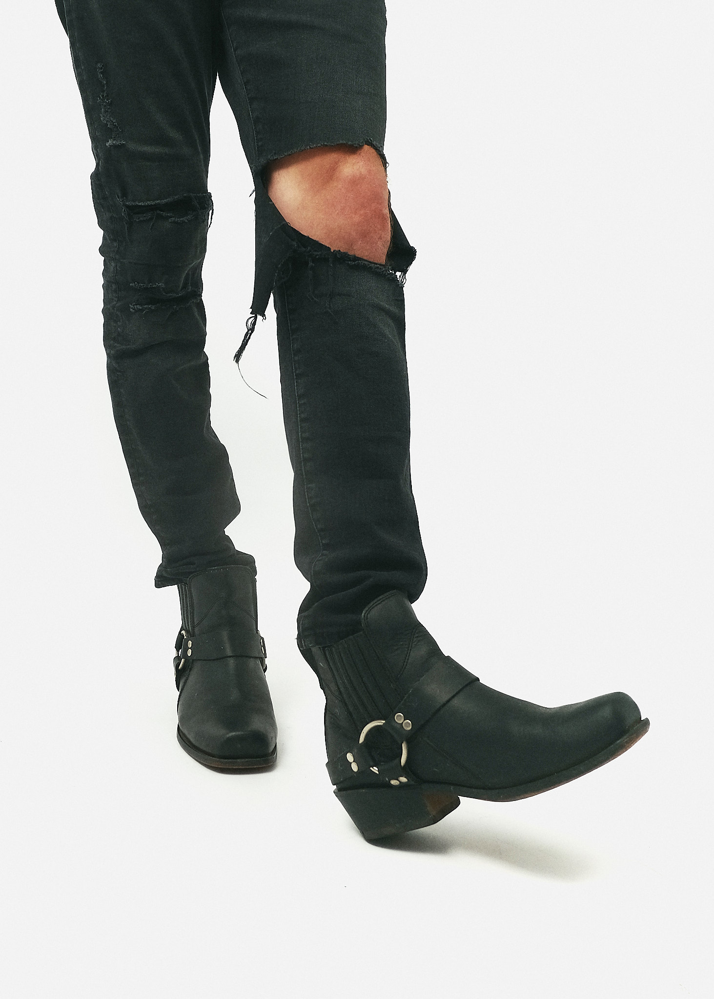 Байкерські чоботи: Масивне взуття з квадратним носком та ремінцями на щиколотках. Надійна класика, що завершує агресивний силует і додає стійкості всьому комплекту.