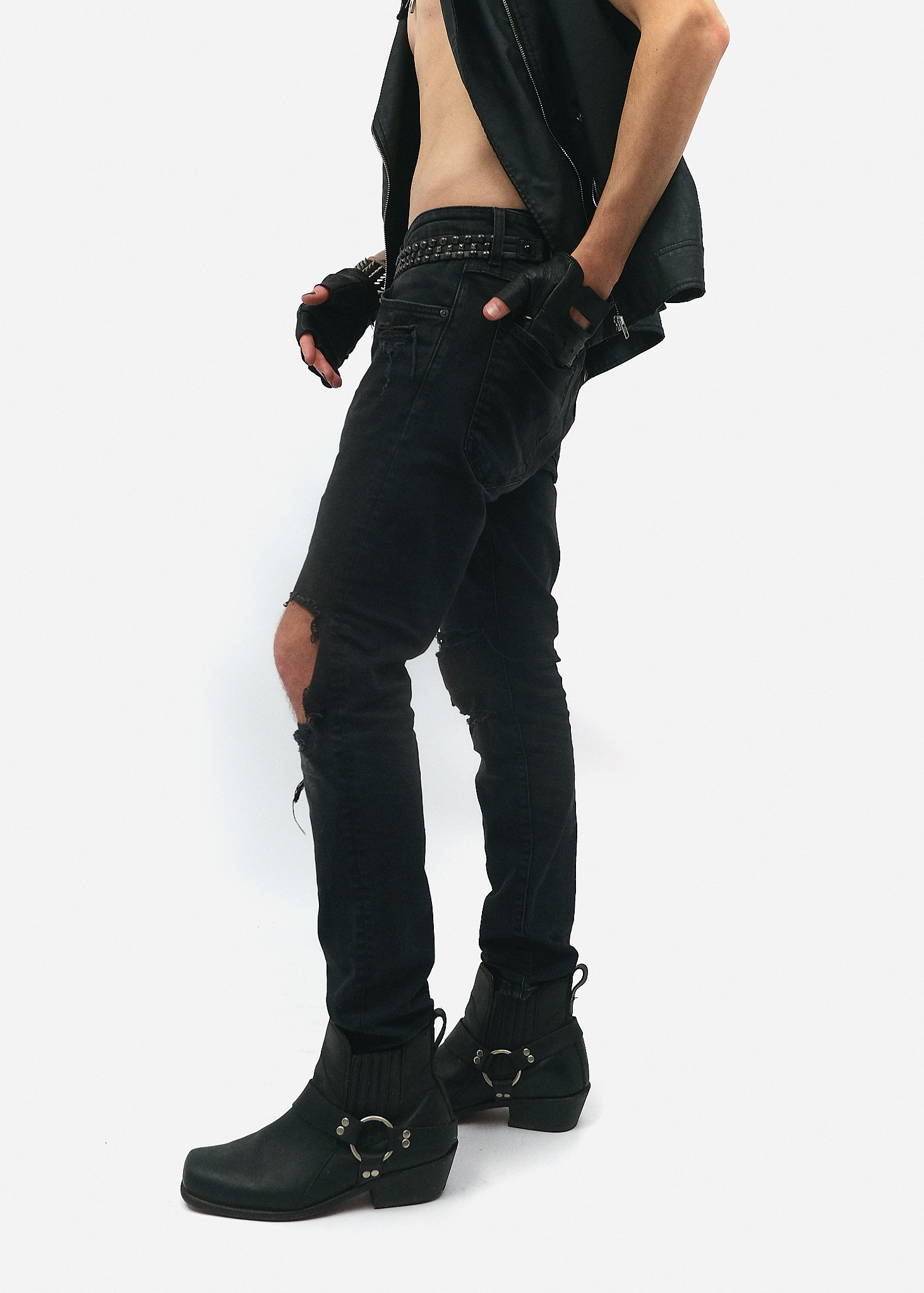 Деструктивні джинси (Destroyed Denim): Чорні вузькі джинси з масивними розривами на колінах та ефектом сильної зношеності. Це ключовий елемент гранж-естетики, що підкреслює недбалий та бунтарський характер луку.