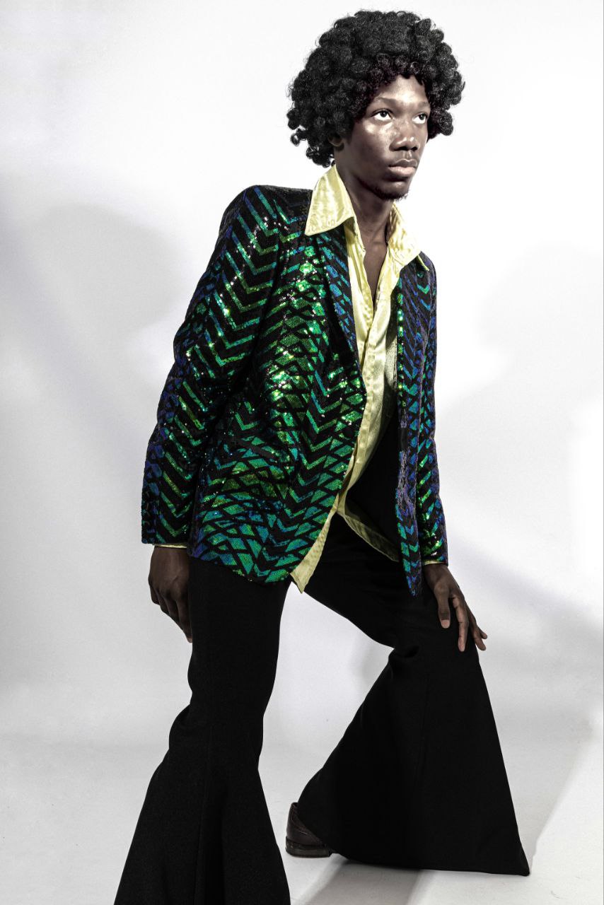 Секвінований піджак: Головний акцент образу. Паєтки (sequins) з геометричним візерунком «шеврон» у смарагдово-синіх тонах були піком клубної моди, оскільки вони ідеально відбивали світло диско-кулі.