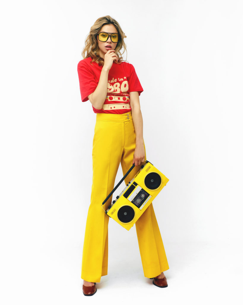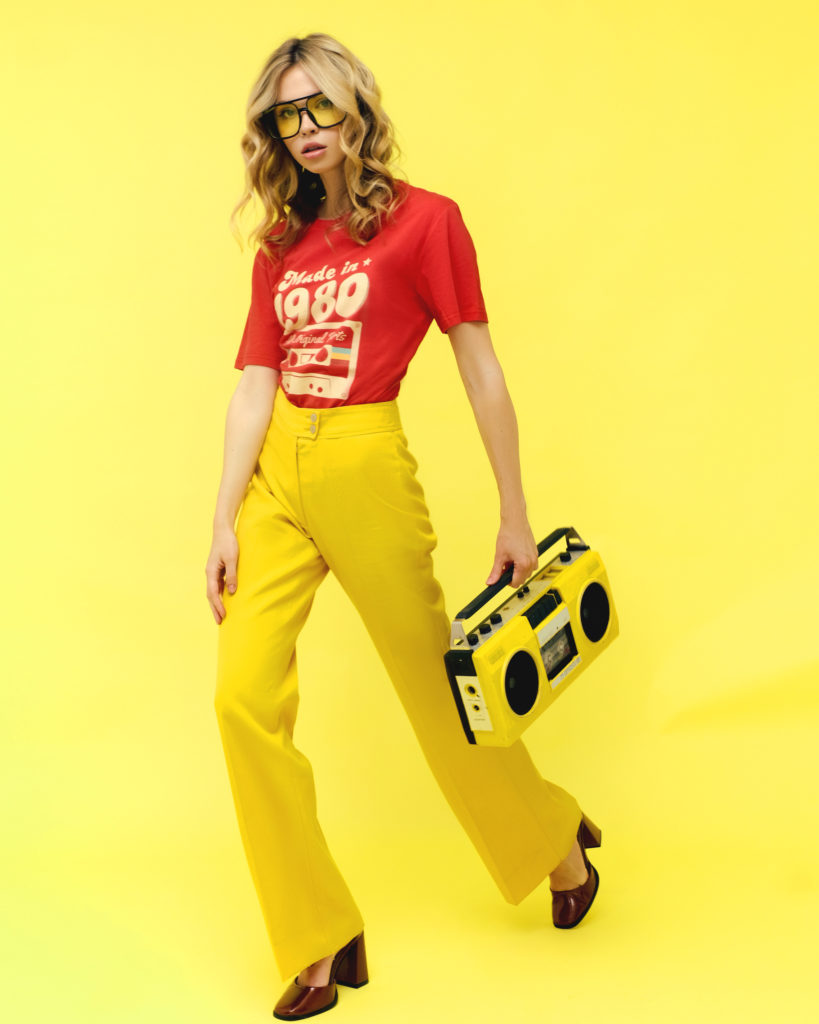 Яскравий та ексцентричний образ, побудований на сміливому поєднанні первинних кольорів — червоного та жовтого. Висока посадка штанів у поєднанні з тематичним принтом створює ностальгічний настрій, а масивні аксесуари додають луку завершеності та автентичного драйву епохи аналогового звуку.