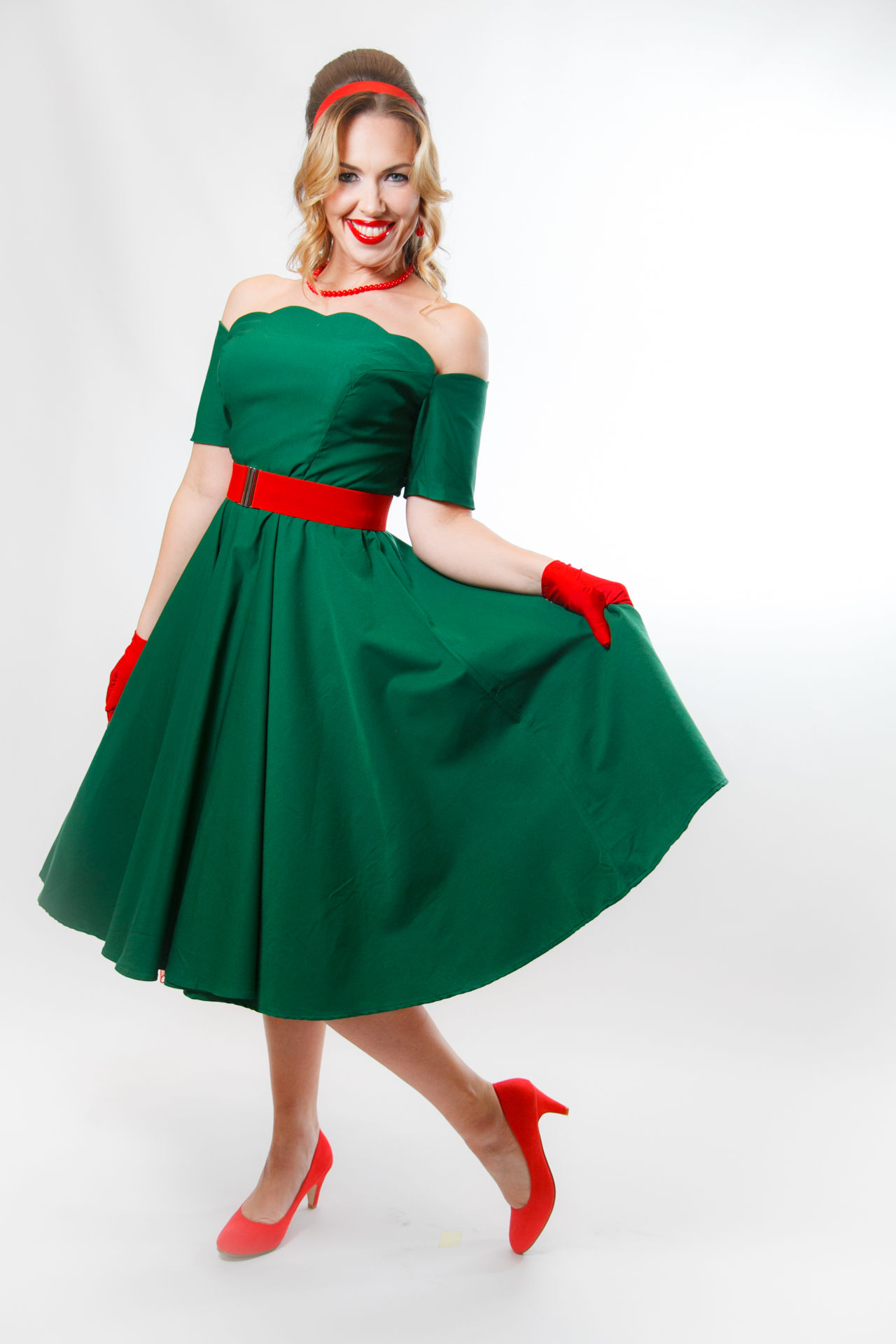 Яскравий та життєствердний образ, побудований на сміливому контрасті смарагдового та червоного кольорів. Цей ансамбль переосмислює класичну елегантність 50-х через призму стилю "стиляг", створюючи динамічний та незабутній силует для вечірок або урочистих подій.