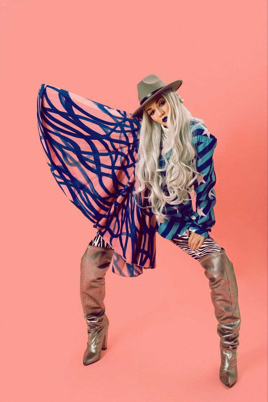 Найбільш зухвалий та авангардний образ колекції, що руйнує всі стереотипи про класичний Хелловін. Це вибухове поєднання патріотичних зіркових мотивів, абстрактної графіки та гламурного футуризму. Лук створений для справжніх ікон стилю, які готові перетворити будь-яку вечірку на власне арт-шоу, де кожен рух створює нову візуальну ілюзію.