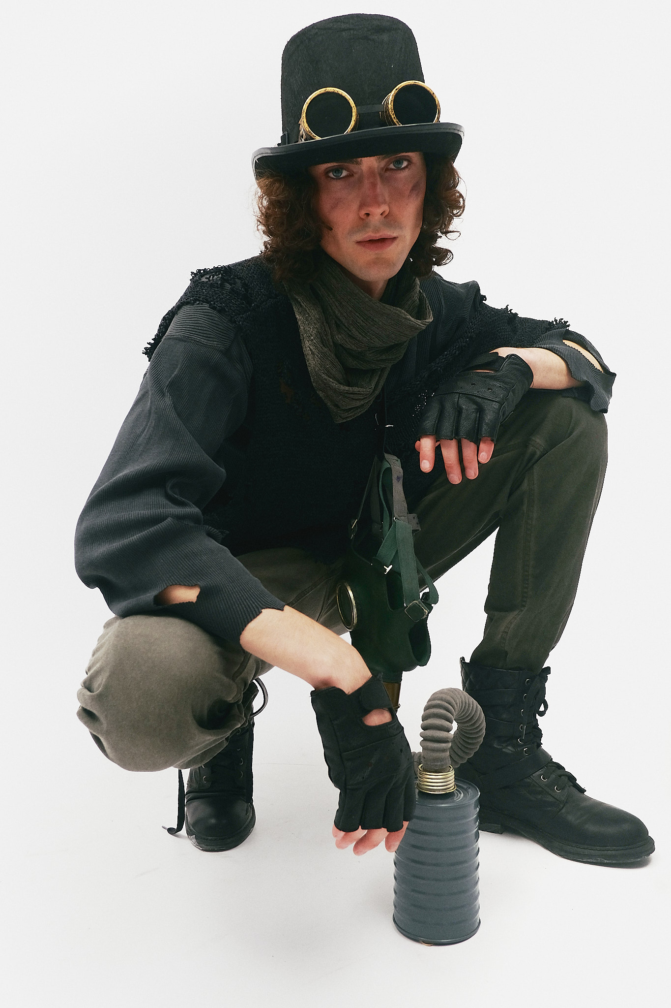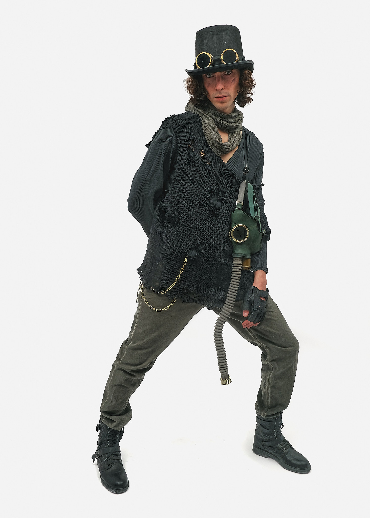 Складний та багатошаровий образ, що втілює естетику «підземного алхіміка» або інженера з постапокаліптичного майбутнього. Лук поєднує класичні вікторіанські елементи (циліндр) із брутальними індустріальними аксесуарами. Виражена деструкція тканин та використання захисного спорядження створюють атмосферу людини, яка виживає в умовах токсичного туману та парових машин. Образ виглядає автентично, загадково та дуже деталізовано.