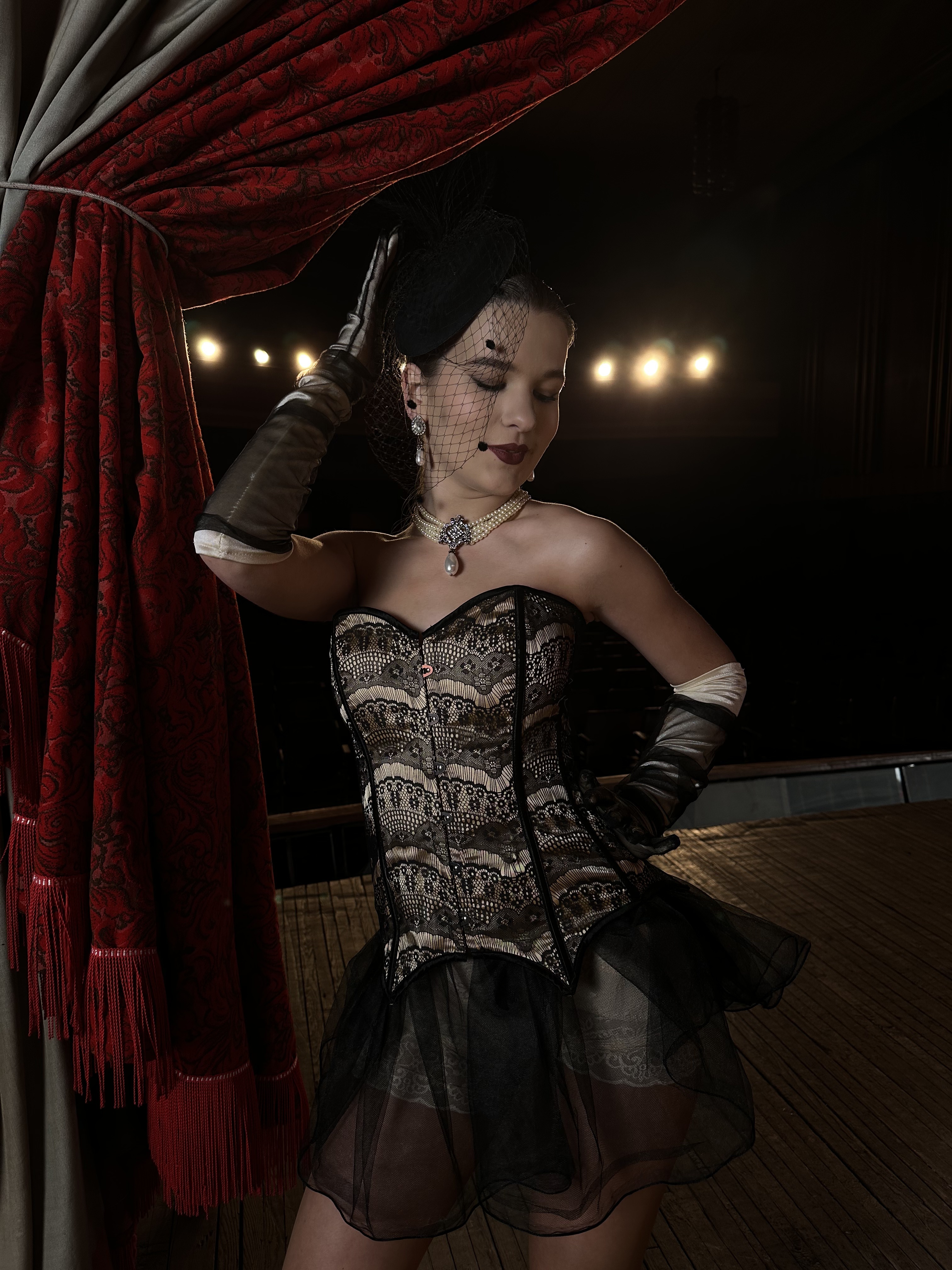 Корсет: Жорсткий корсет із гострим нижнім краєм, виконаний із парчі з золотистим візерунком та накладеним поверх тонким чорним мереживом.