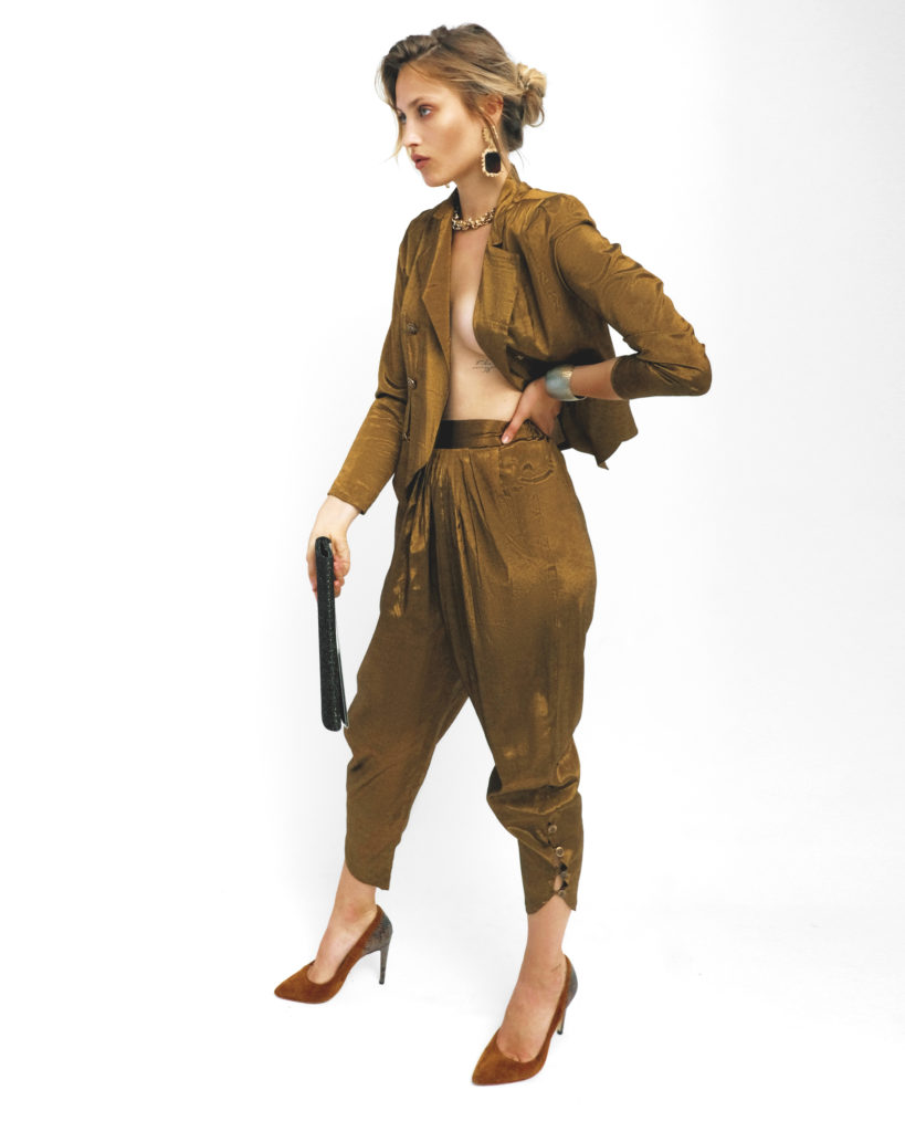 Вишуканий та сміливий монохромний образ у бронзових тонах, що балансує на межі вечірньої класики та авангарду. Використання шовковистої тканини з відливом додає луку особливого сяйва, а гра з пропорціями — вкорочений жакет та штани-галіфе — створює динамічний та сучасний для свого часу силует. Цей ансамбль випромінює статусність та впевнену жіночність.