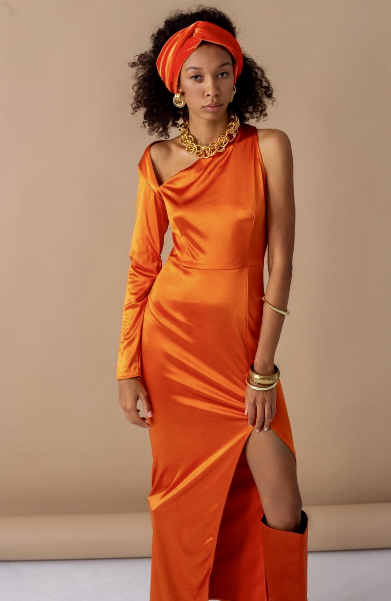 Сукня: Максі-сукня з блискучого атласу глибокого гарбузового кольору. Асиметричний крій з одним довгим рукавом та відкритим плечем створює динамічний візуальний ритм, а високий розріз по нозі додає образу звабливості.