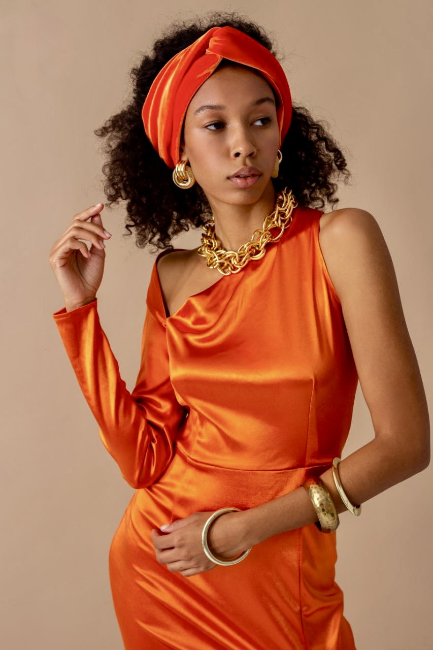 Сміливий та експресивний образ, що базується на монохромі в насиченому помаранчевому відтінку. Це ідеальне втілення сучасної етніки та гламуру 70-х, адаптованих для стильної фотосесії. Гра з асиметрією та масивними золотими акцентами створює магнетичний силует, який виглядає дорого, впевнено та сонячно. Look фокусується на впевненості та вільній жіночності.