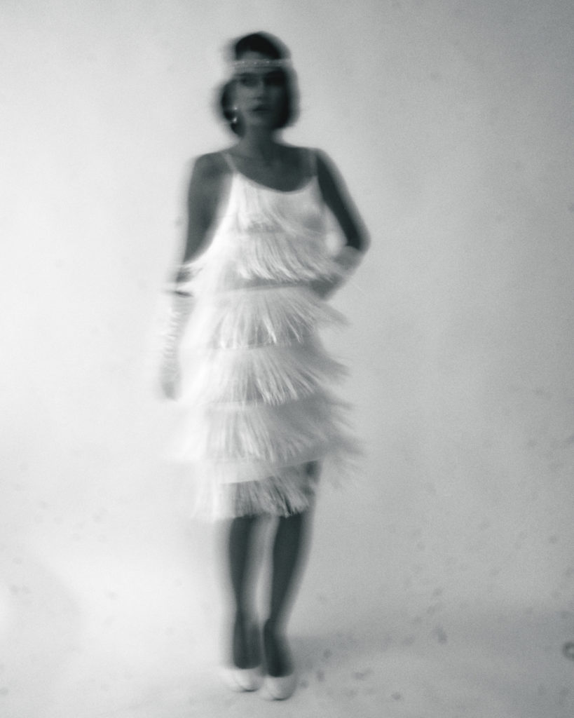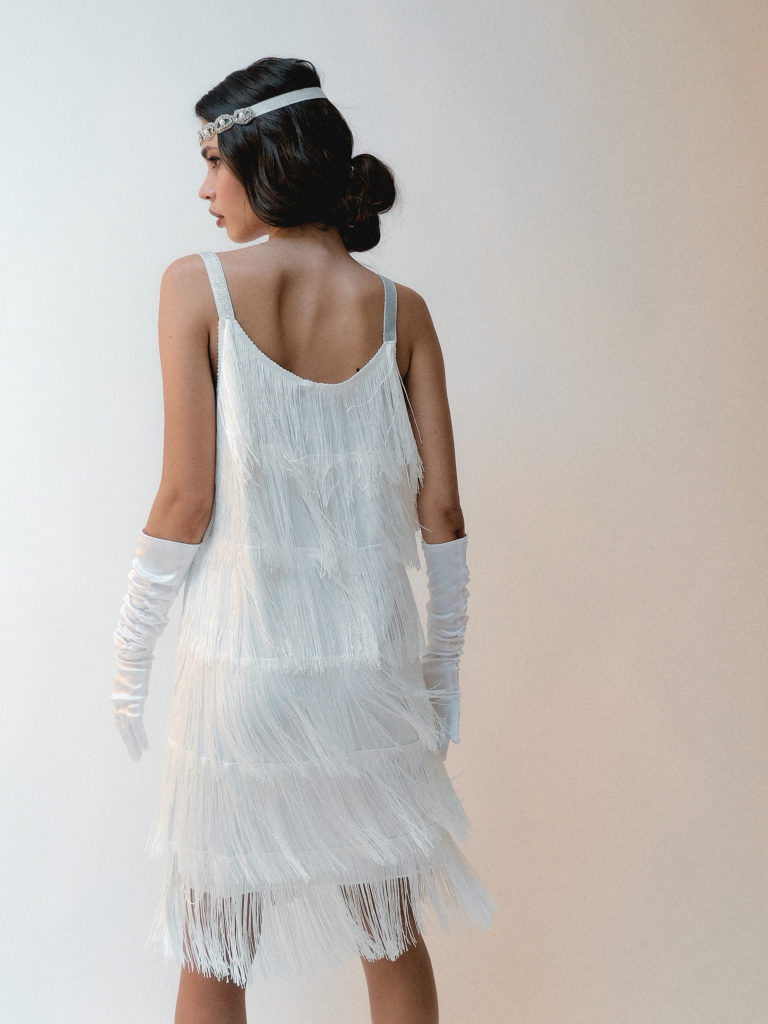 Легкий та витончений образ у стилі «флаппер», що втілює дівочу безтурботність та гламур епохи джазу. Білосніжна палітра в поєднанні з багатошаровою бахромою та сріблястими акцентами створює ефірний силует, який оживає в кожному русі, немов іскристе шампанське.