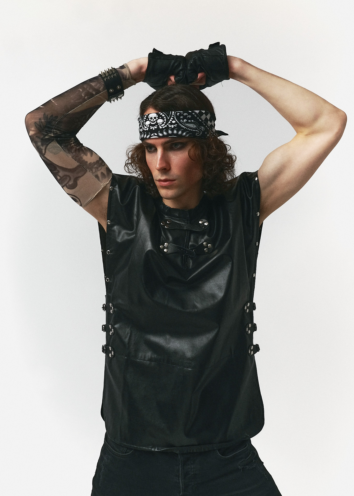 Аксесуари (Рукавички та напульсник): Шкіряні мітенки з відкритими пальцями та широкий браслет із металевими шипами-пірамідами. Ці деталі акцентують увагу на руках і додають необхідної гостроти.