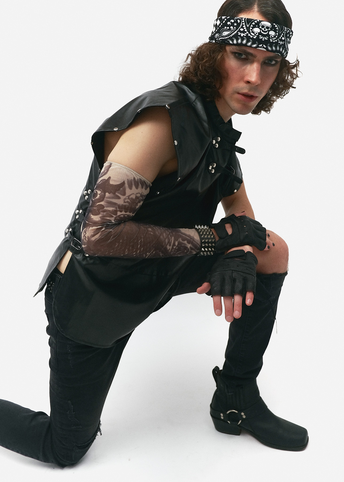 Містичний та водночас агресивний лук, що переосмислює класичний панк-рок через призму темного фентезі. Головним акцентом є нестандартний крій верхнього одягу, який нагадує сучасний обладунок. Образ побудований на грі чорних фактур — матової шкіри та грубого деструктивного деніму, що створює силует нічного воїна або фронтмена андеграундного гурту. Це вибір для тих, хто шукає унікальну форму самовираження, де брутальність поєднується з витонченим дизайном деталей.