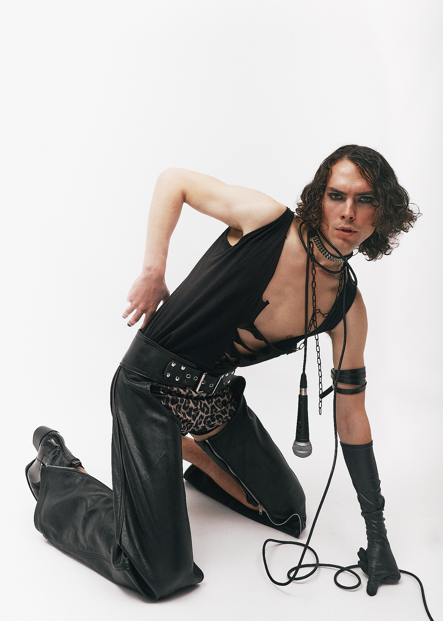 Екстравагантний та зухвалий образ, що ідеально підходить для фронтмена рок-гурту або концептуального перформансу. Лук побудований на поєднанні анімалістичного принту, агресивної шкіри та металевих аксесуарів, що створює атмосферу чистого драйву та свободи самовираження. Цей образ відкидає рамки повсякденності, роблячи ставку на провокацію, сексуальність та сценічний драматизм.