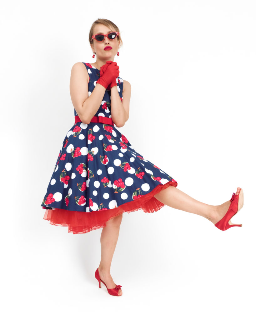 Сукня: Приталена сукня без рукавів темно-синього кольору. Принт поєднує великий білий горох та яскраві грона стиглих вишень. Спідниця фасону «сонце» створює класичний силует «пісочний годинник».
