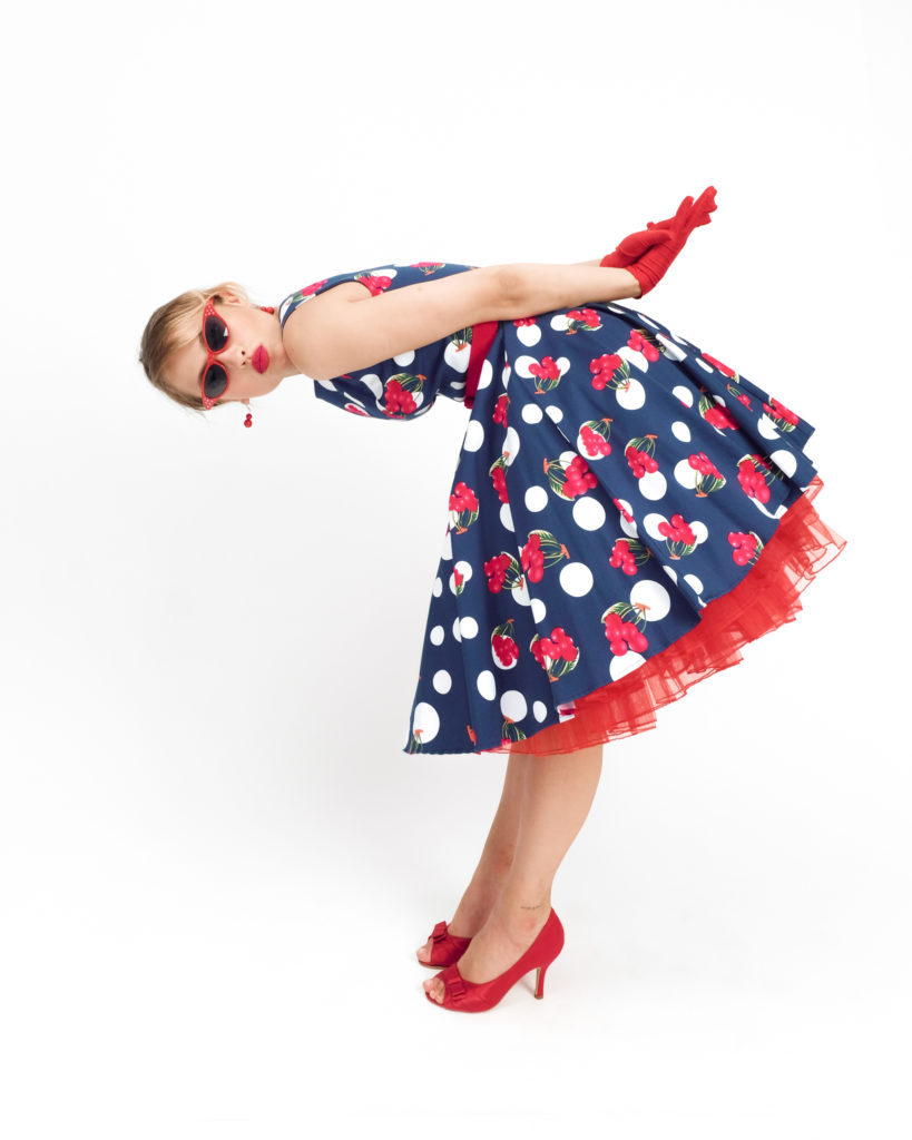 Грайливий та апетитний образ у стилі «rockabilly», що базується на класичному поєднанні темно-синього, білого та яскраво-червоного. Використання подвійного принту (горошок + вишні) створює динамічний візуальний ритм, а насичені червоні аксесуари додають луку драматизму та завершеності.