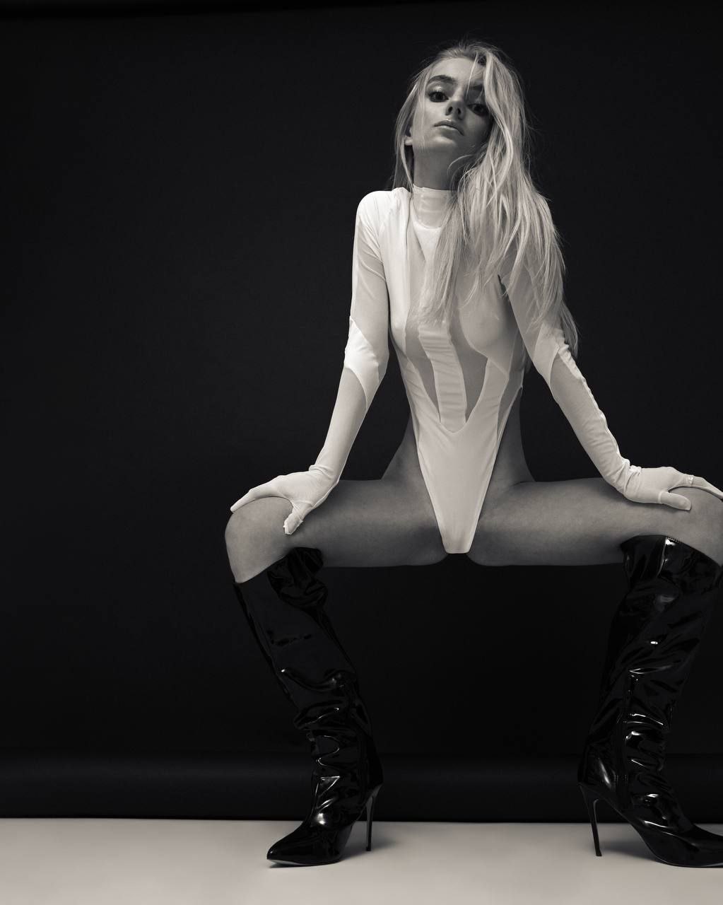 Радикальний та графічний образ, що досліджує тему штучного інтелекту та андроїдної досконалості. Лук побудований на різкому контрасті білосніжного текстилю та чорного вінілу, створюючи візуальний код майбутнього, де мода стає частиною інтерфейсу. Високі розрізи та прозорі вставки підкреслюють анатомічність, перетворюючи тіло на архітектурний об'єкт. Це ідеальний вибір для авангардних зйомок у стилі «minimal sci-fi».