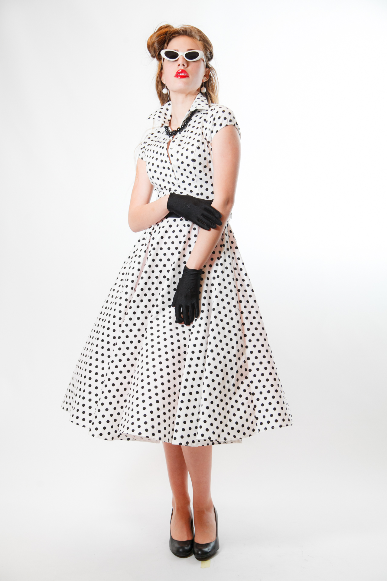 Сукня: Світла сукня міді у дрібний чорний горошок. Модель має комірець стійку, короткі рукави та пишну спідницю, що створює класичний жіночний об'єм.