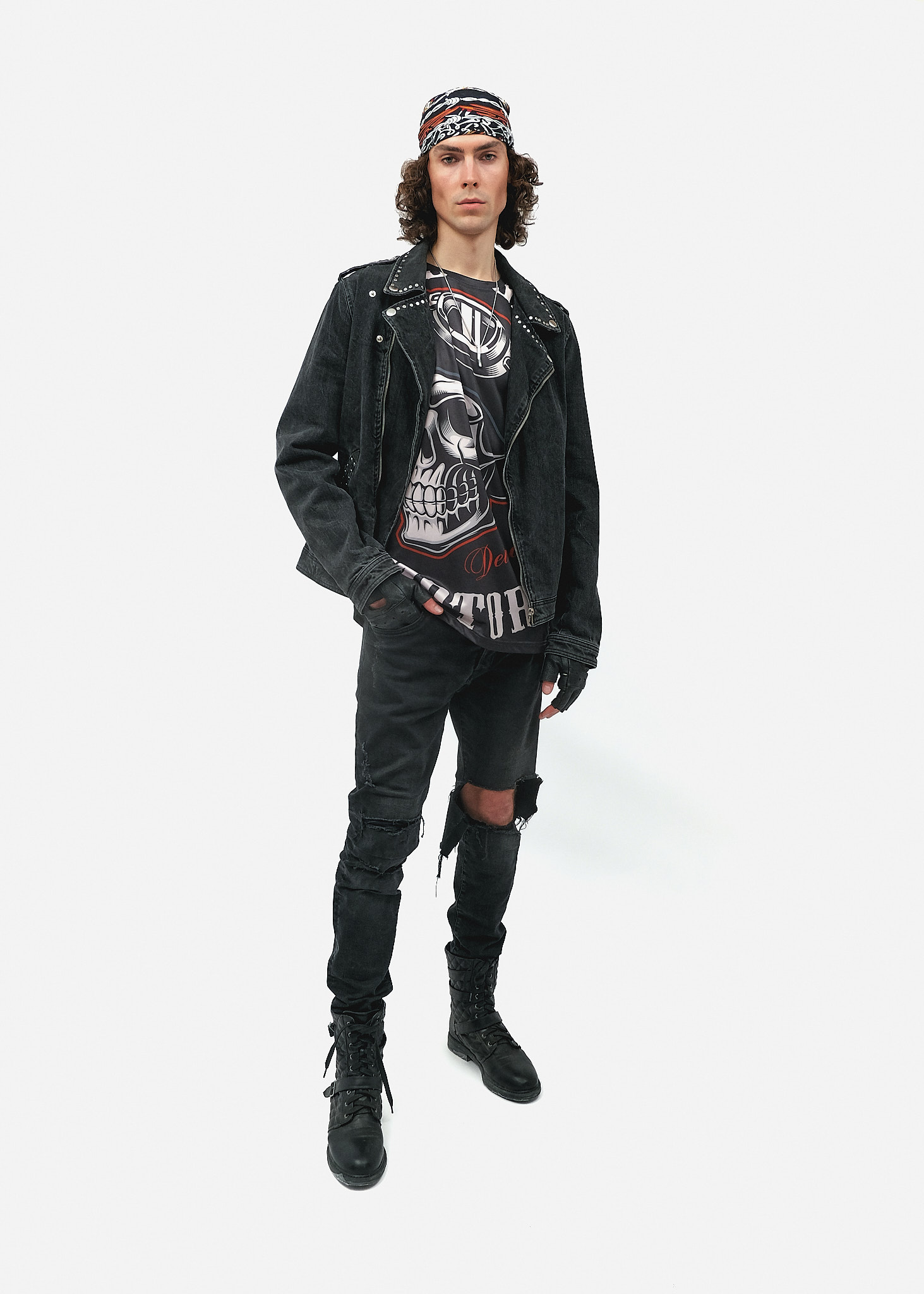 Джинсова куртка-косуха: Виконана з цупкого чорного деніму з ефектом легкого виварювання. Класичний крій косухи з широкими лацканами, декорованими металевими заклепками по краях, додає образу автентичної важкості.