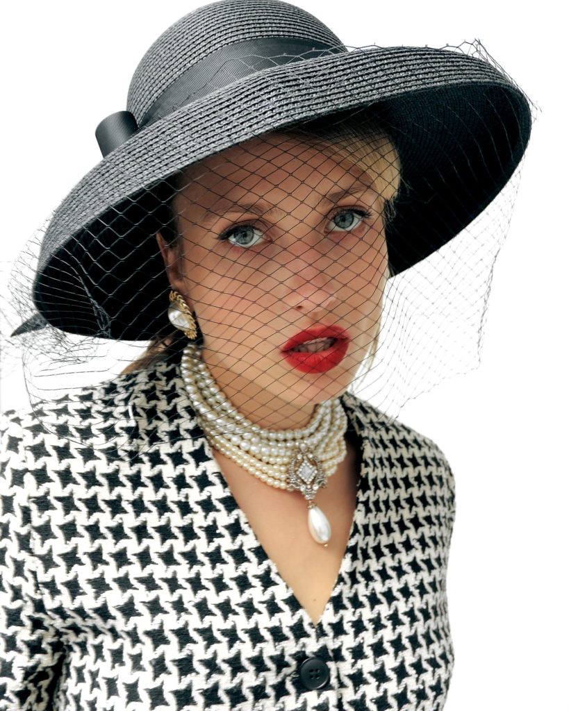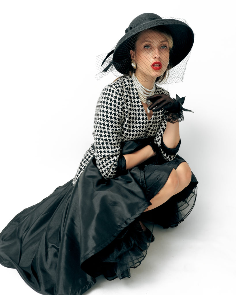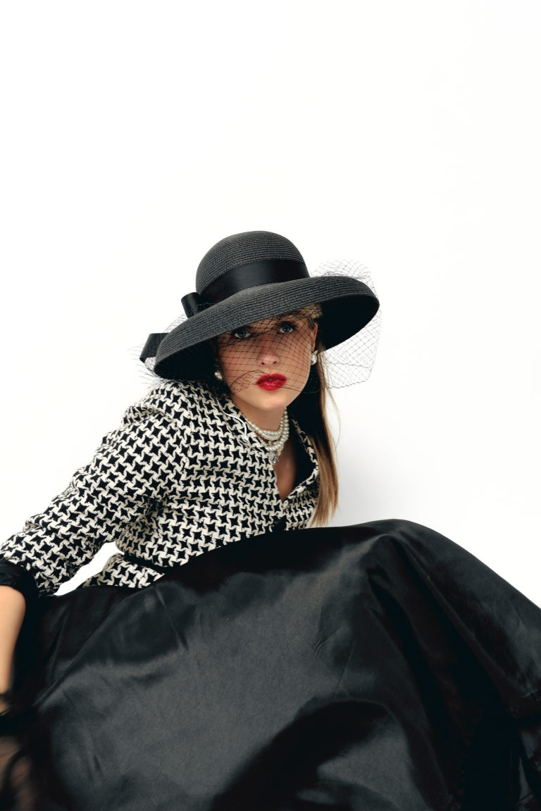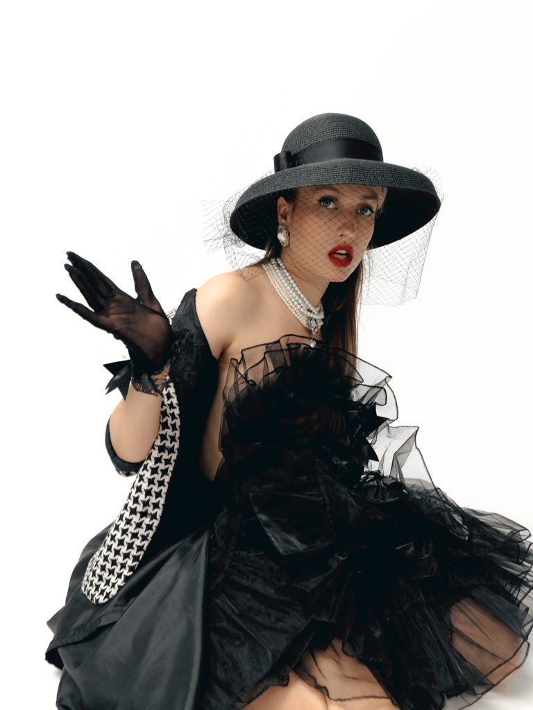 Високохудожній та драматичний образ, що базується на суворій чорно-білій палітрі. Він ідеально передає атмосферу "золотої ери" Голлівуду, де кожен елемент працює на створення образу загадкової та недосяжної діви. Гра текстур — від щільного твіду до невагомого фатину та блиску перлів — робить цей монохромний лук неймовірно глибоким та статусним.