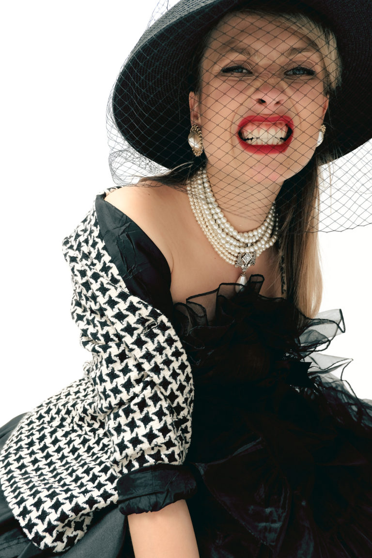 Капелюх: Елегантний чорний капелюх із широкими крисами, доповнений витонченою вуаллю-сіткою, що додає образу таємничості та театрального шарму.