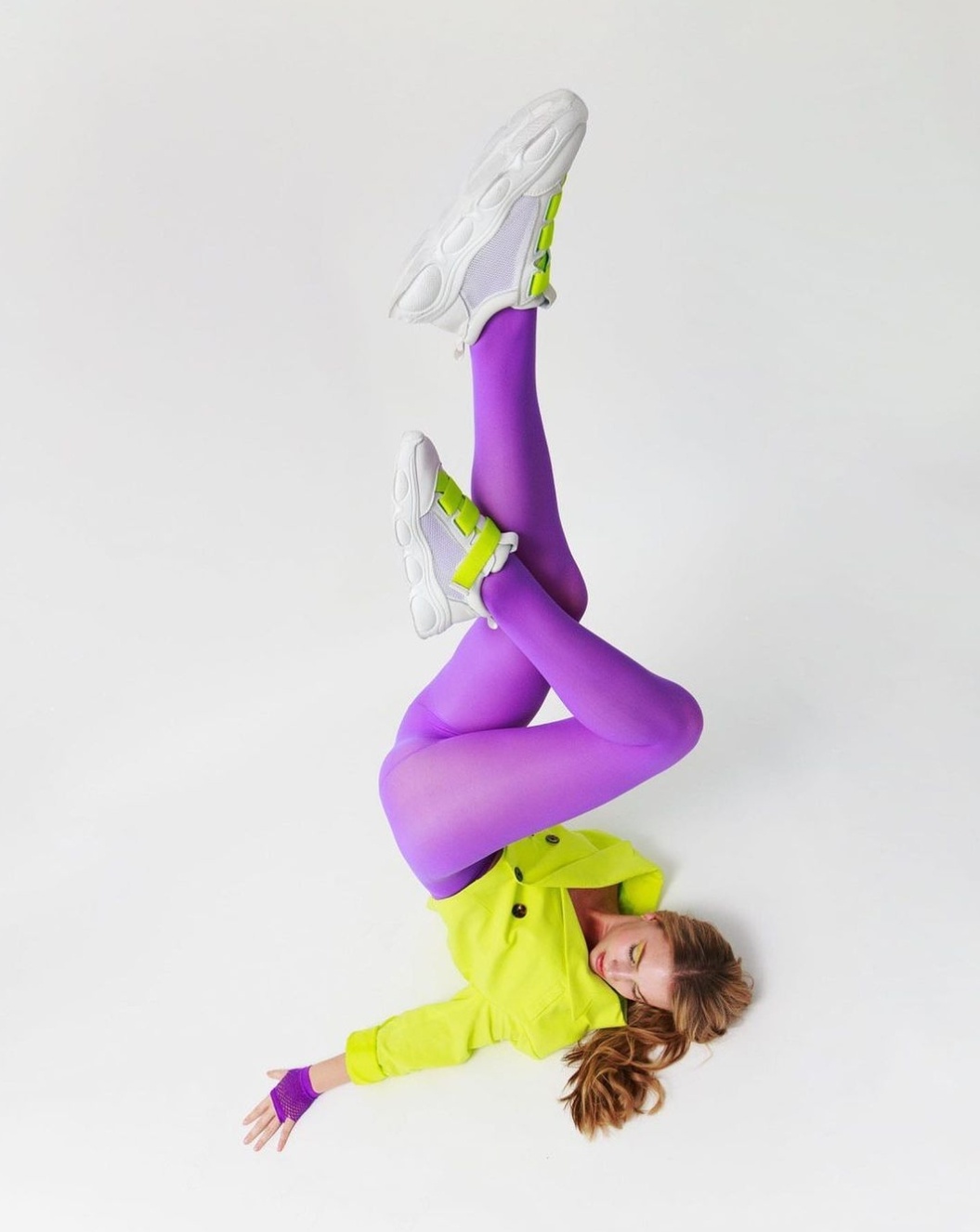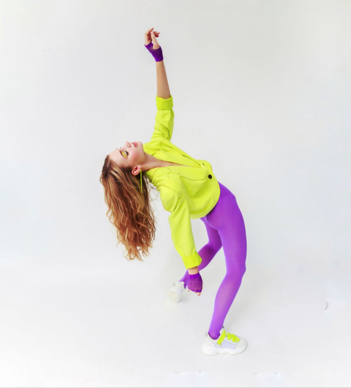 Екстравагантний та динамічний образ, побудований на максимальному колірному контрасті між електричним фіолетовим та отруйним лимонним кольорами. Поєднання класичного силуету жакета з ультра-облягаючими легінсами створює футуристичний вигляд, характерний для ранніх 90-х. Цей лук випромінює впевненість і готовність бути в центрі уваги на будь-якому танцмайданчику.