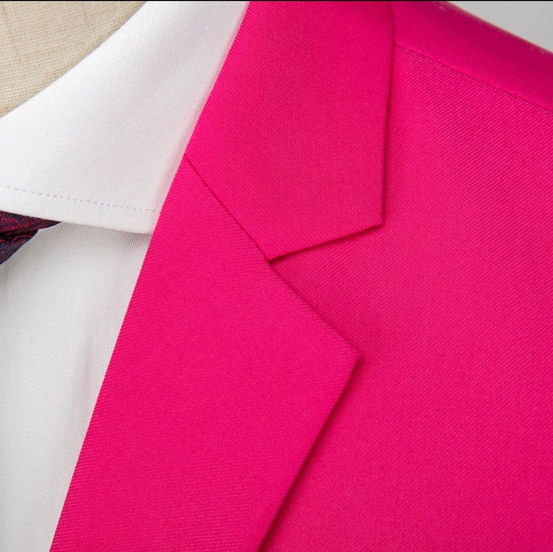 Костюм-двійка: Приталений піджак та заужені штани насиченого кольору "hot pink". Піджак має класичні лацкани та акцентні білі ґудзики на рукавах, що додає образу графічності.
