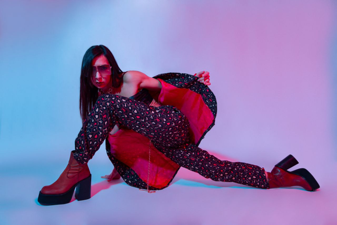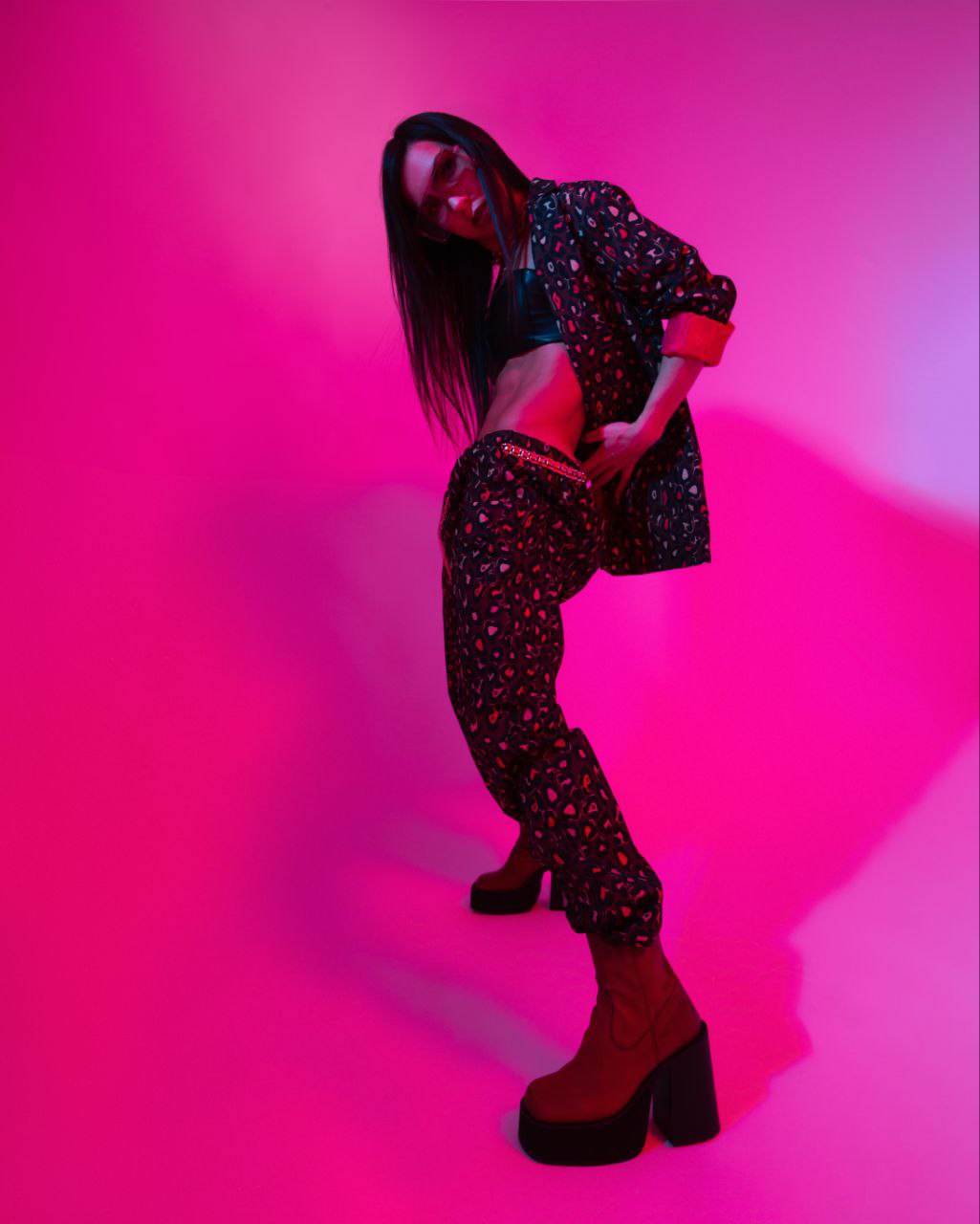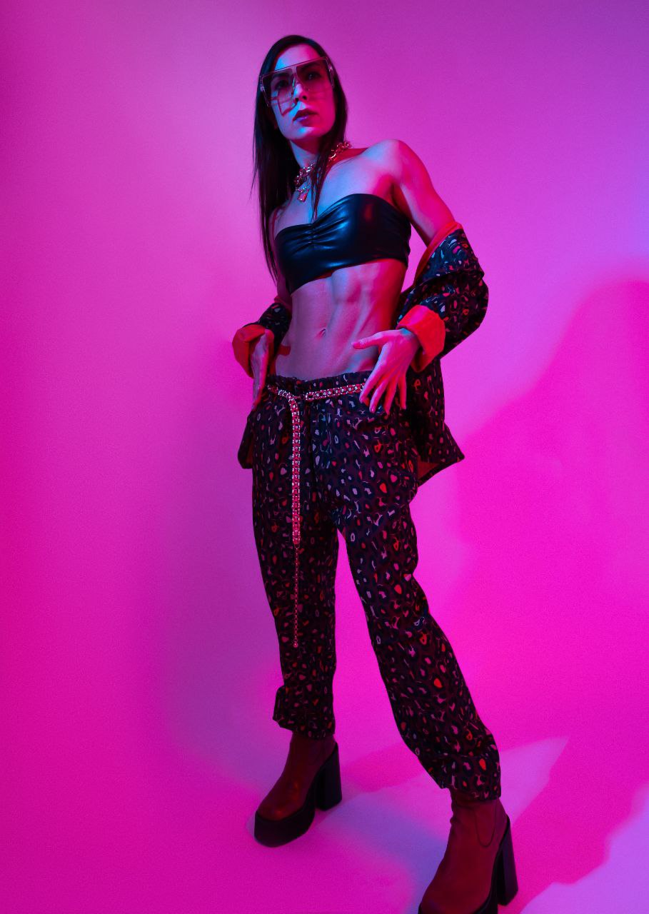 Вибуховий та енергійний образ, що переосмислює класичний леопардовий принт у неонових кольорах майбутнього. Завдяки поєднанню з глибоким синім освітленням та контрастними рожевими акцентами, цей лук створює атмосферу кіберпанк-вечірки. Настрій образу — бунтарська впевненість та свобода рухів. Це ідеальний вибір для креативних фотосесій, де важливо передати драйв, молодіжну енергію та відсутність жодних рамок у стилі.