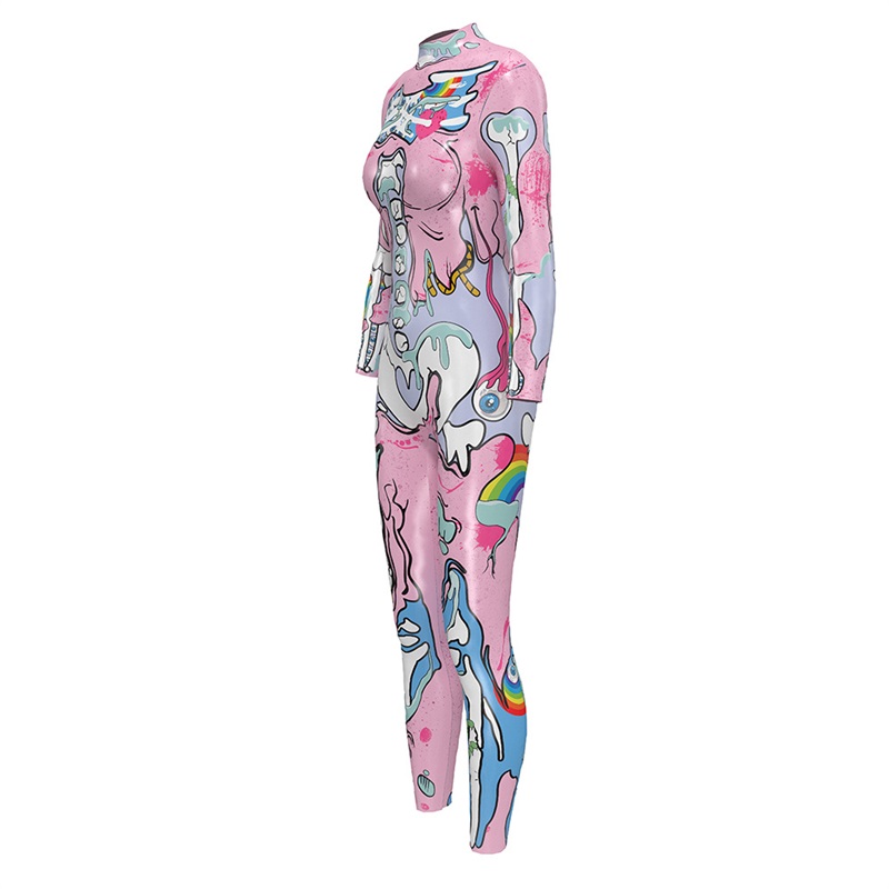 Сміливий та футуристичний погляд на традиційний образ до Дня мертвих. Цей облягаючий комбінезон перетворює анатомічний малюнок на справжній арт-об'єкт завдяки насиченій палітрі рожевих, блакитних та неонових відтінків. Лук створений для тих, хто хоче поєднати містику з естетикою кіберпанку та виділятися навіть у найгустішому тумані вечірки.