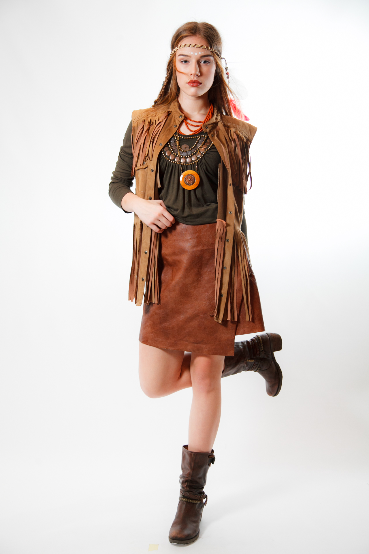 Жилет: Замшевий жилет пісочного кольору з масивним коміром та довгою бахромою по всьому периметру, що додає образу характерного ковбойського шику.