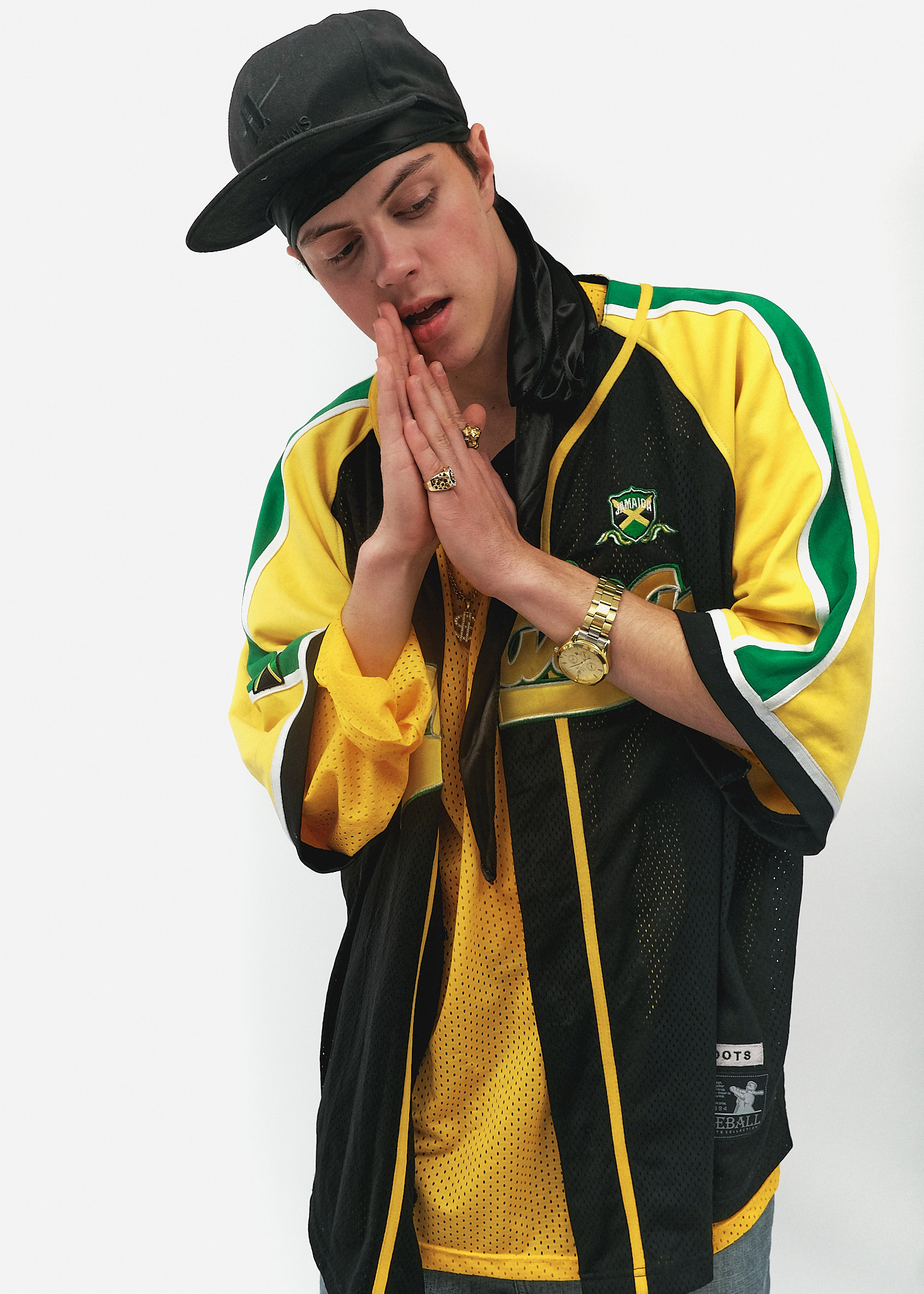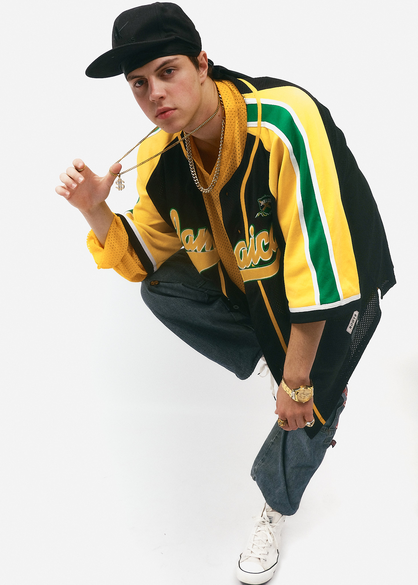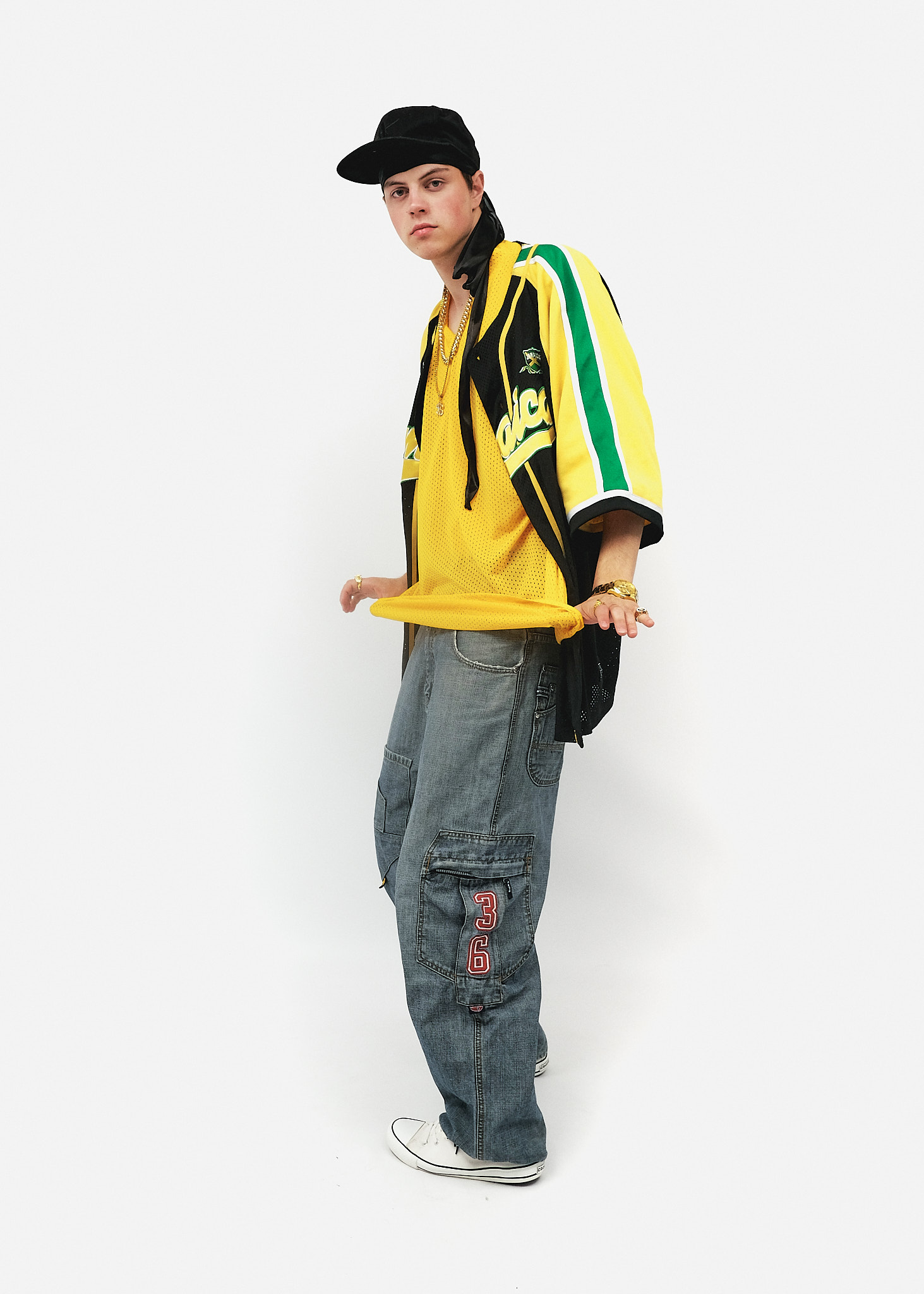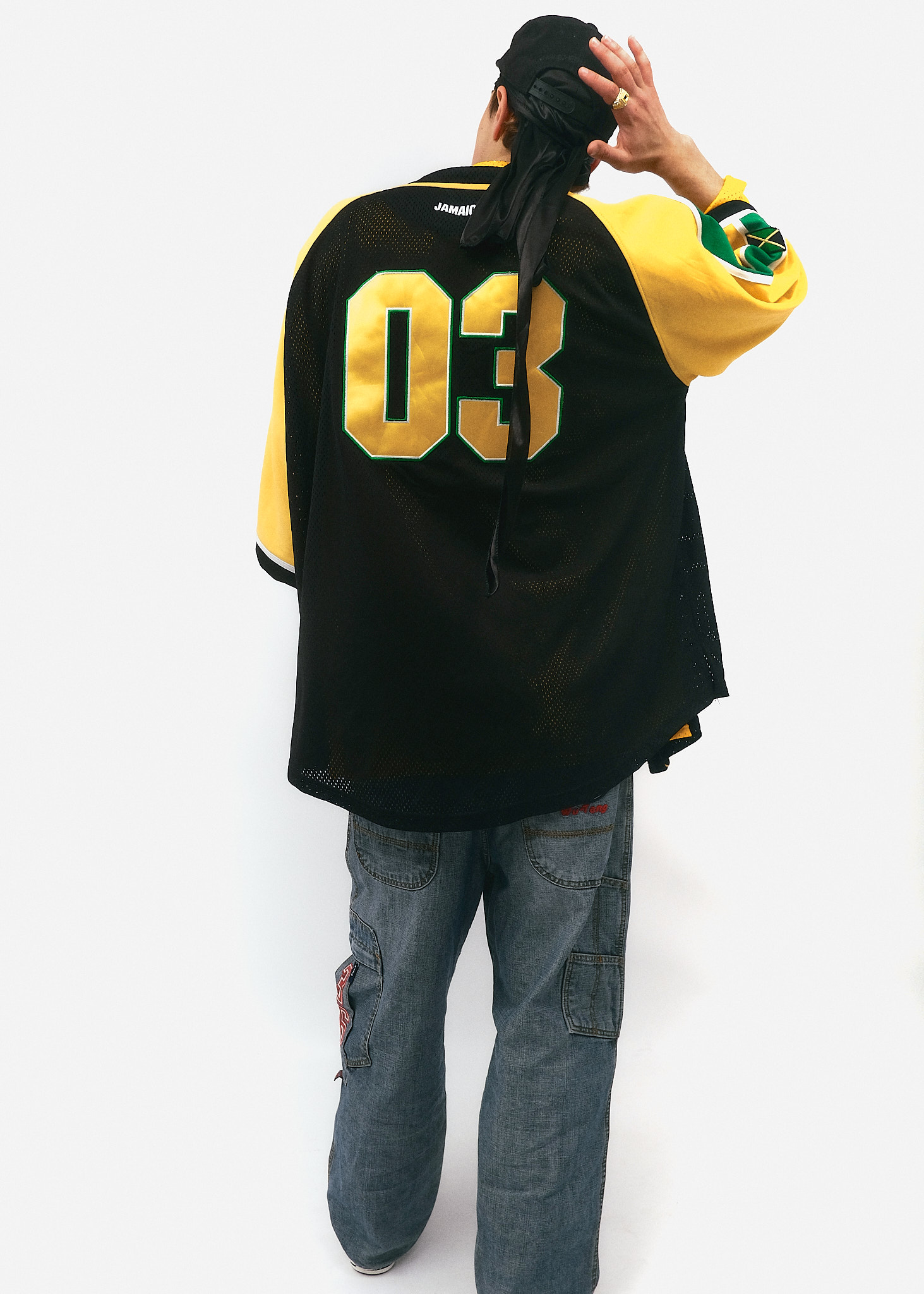Верхній шар: Об'ємна баскетбольна джерсі (oversize jersey) у кольорах прапора Ямайки (чорний, жовтий, зелений). Сітчаста фактура тканини та широкі рукави до ліктів — характерна ознака моди того часу.