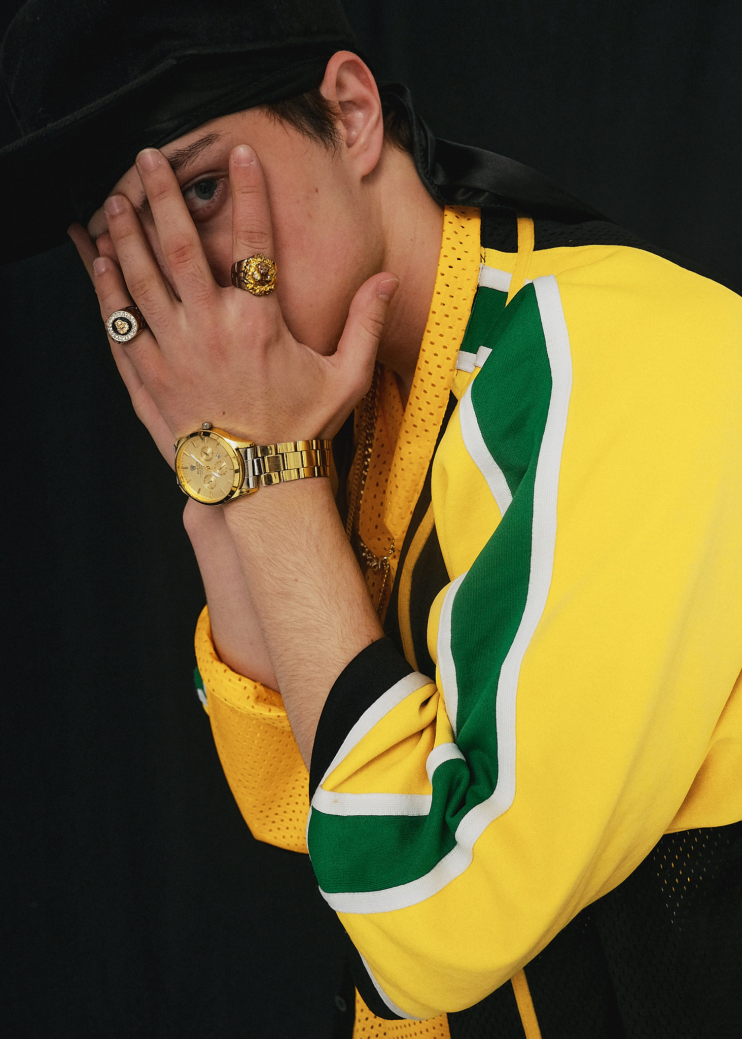 Культовий чоловічий образ 2000-х, що поєднує спортивну естетику з елементами «bling-bling» культури. Завдяки вільному крою, яскравій палітрі спортивної джерсі та великій кількості золотих прикрас, цей лук випромінює впевненість та приналежність до золотої ери реп-індустрії.