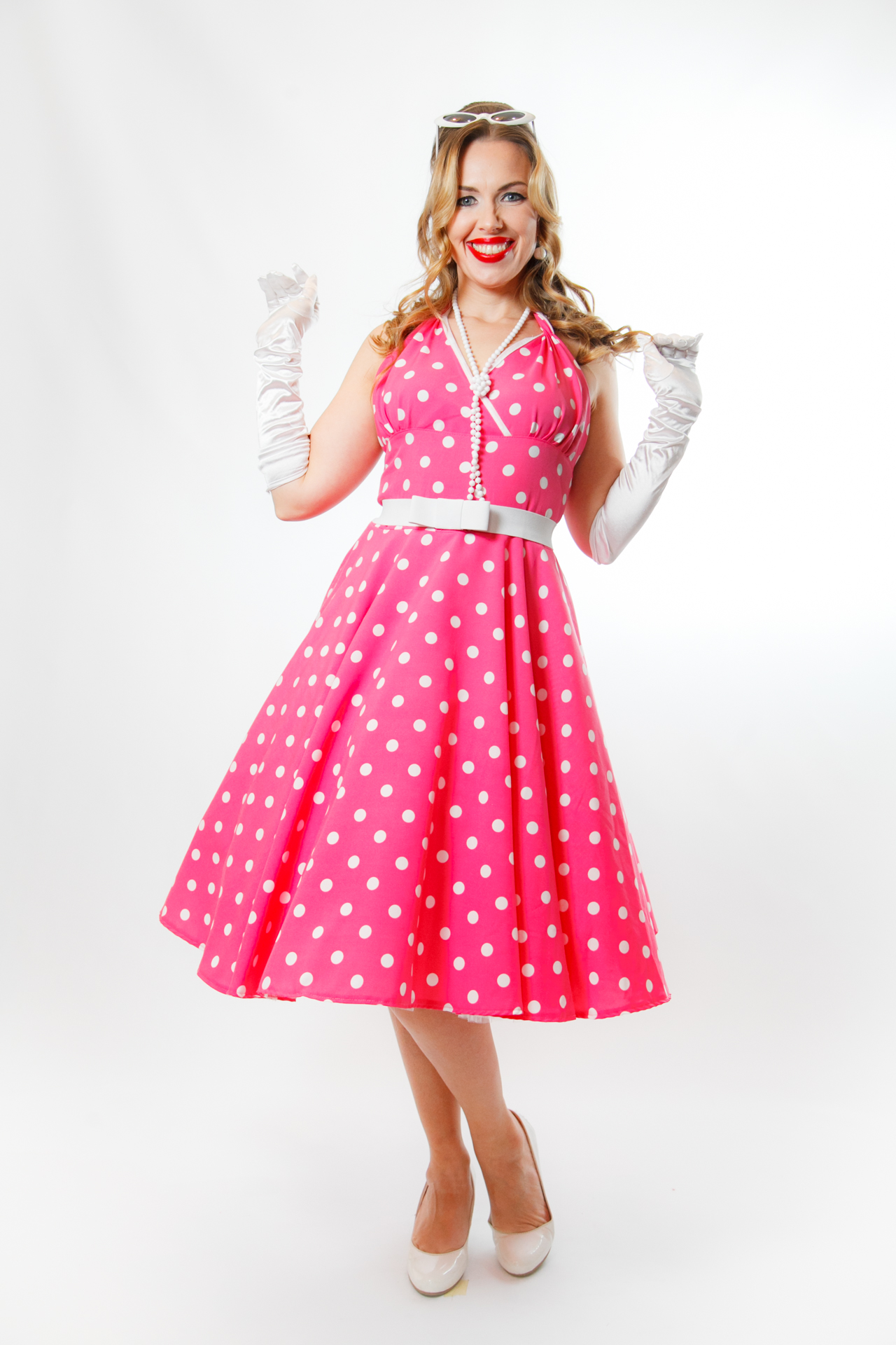 Яскравий та енергійний образ у стилі «retro doll», який акцентує на соковитих кольорах та класичних силуетах середини XX століття. Насичений рожевий відтінок сукні додає сучасного "барбікор" акценту до традиційного вінтажного фасону, створюючи образ, що випромінює впевненість та позитив.