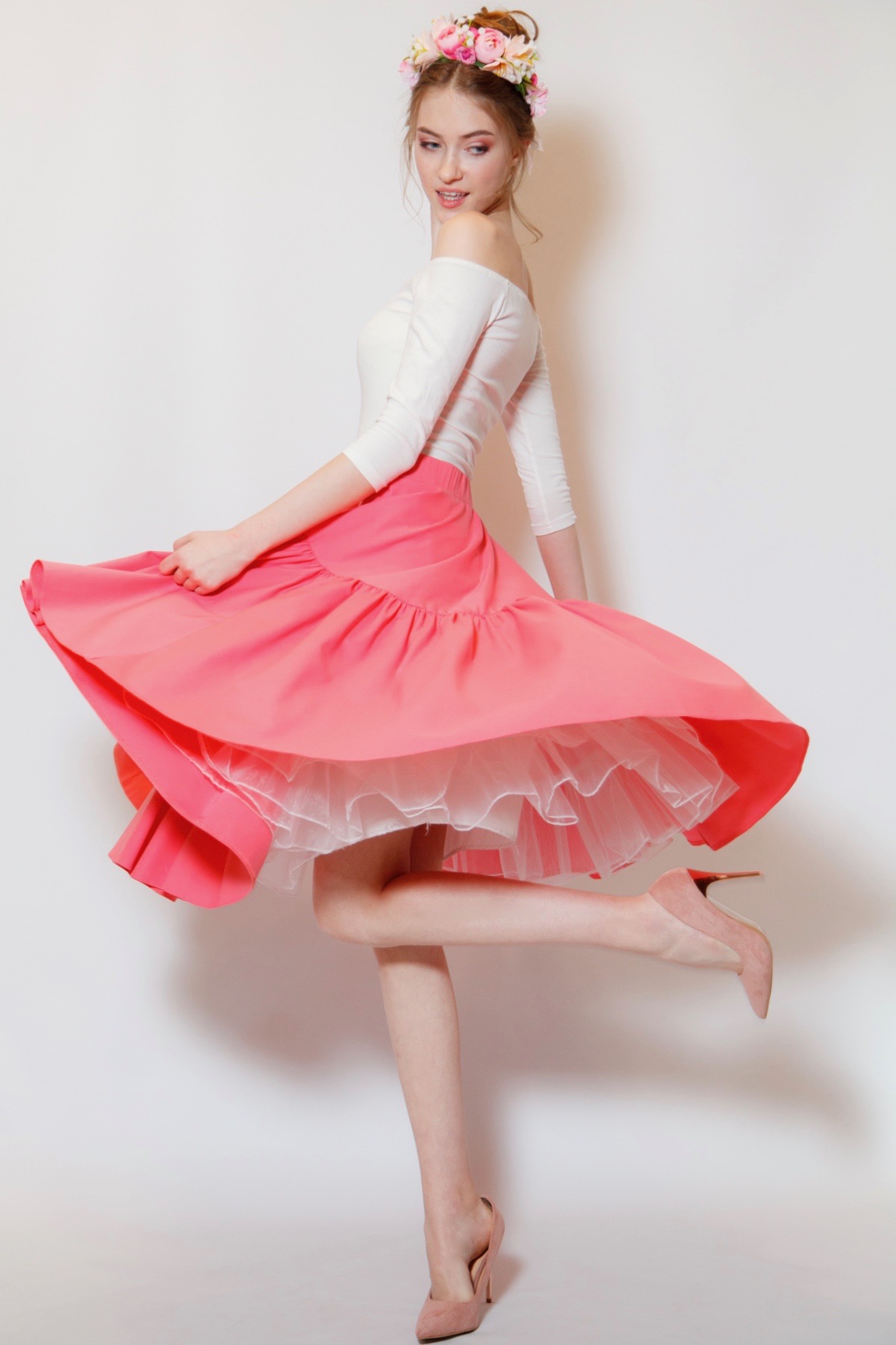 Багатошарова спідниця-сонце кольору фламінго: Яскрава спідниця насиченого рожевого відтінку з акцентною оборкою по нижньому краю. Пишний крій створює неймовірну динаміку в русі, а під'юбник додає необхідного об'єму для створення класичного силуету "принцеси".