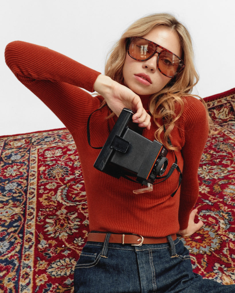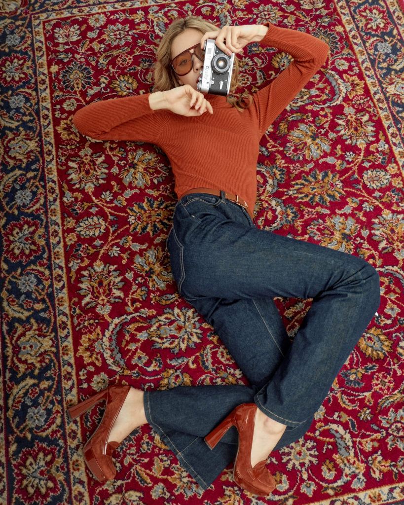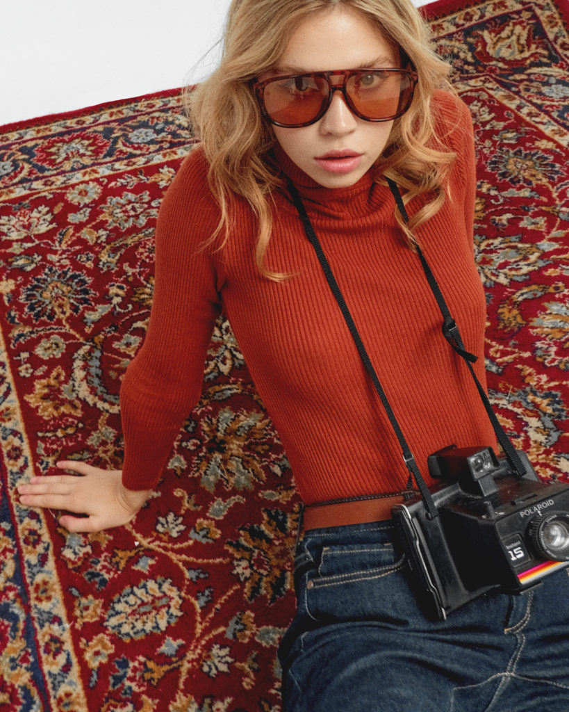 Теплий та гармонійний образ у стилі ретро-кежуал, що базується на поєднанні насиченого рудого кольору та класичного темно-синього деніму. Лаконічність трикотажу підкреслює ідеальну посадку речей, а виразні деталі роблять лук впізнаваним та завершеним. Це ідеальне втілення осіннього настрою в моді 70-х, де комфорт поєднується зі стилем.
