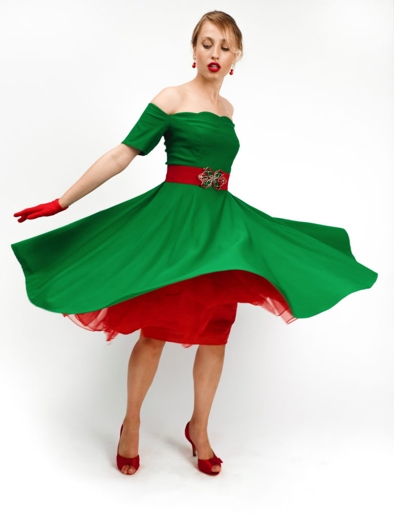 Яскравий та енергійний образ у стилі "pin-up", що майстерно грає на контрасті насиченого зеленого та глибокого червоного кольорів. Ансамбль випромінює святковий настрій та динаміку, відсилаючи до золотої ери жіночності середини XX століття.