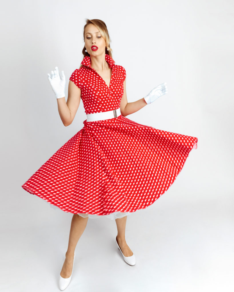 Енергійний та пристрасний образ, що став справжнім символом епохи пін-апу. Поєднання яскраво-червоного кольору з білим принтом "polka dot" створює іскристий візуальний ефект, який найкраще розкривається в русі, підкреслюючи життєрадісність та драйв стилю 1950-х років.