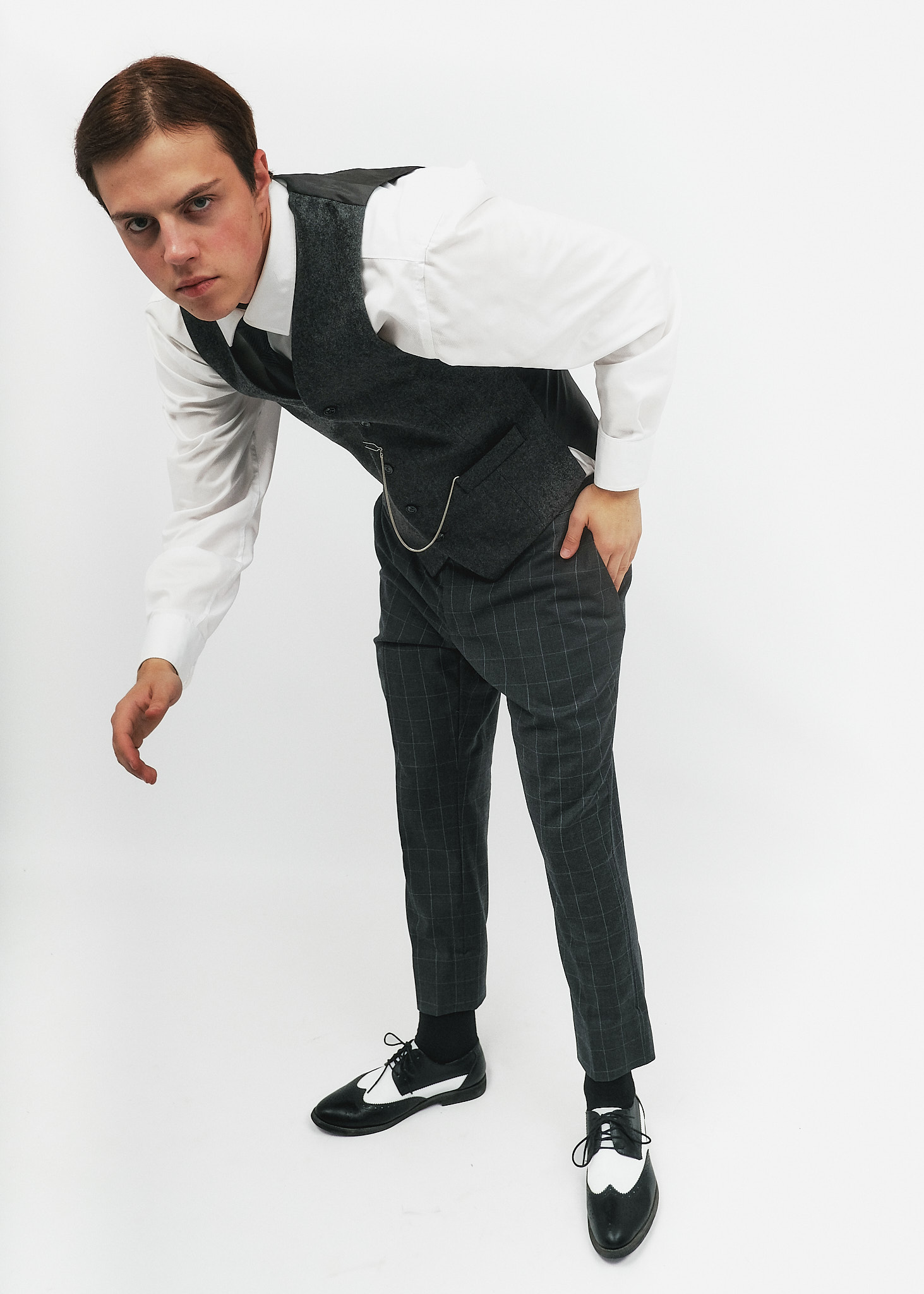 Взуття: Двоколірні чорно-білі броги (spectator shoes) з характерною перфорацією. Це знакове взуття епохи джазу, що робить образ максимально впізнаваним.