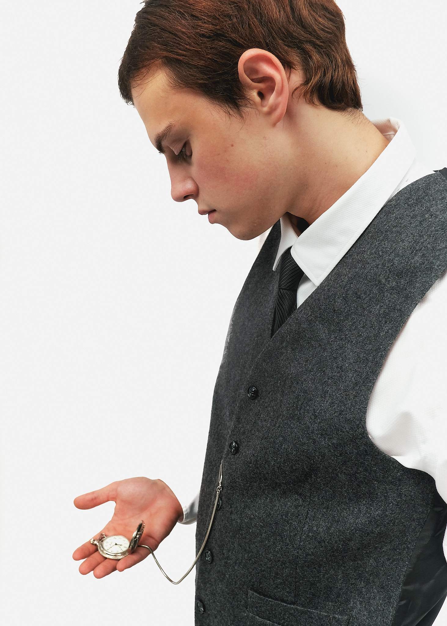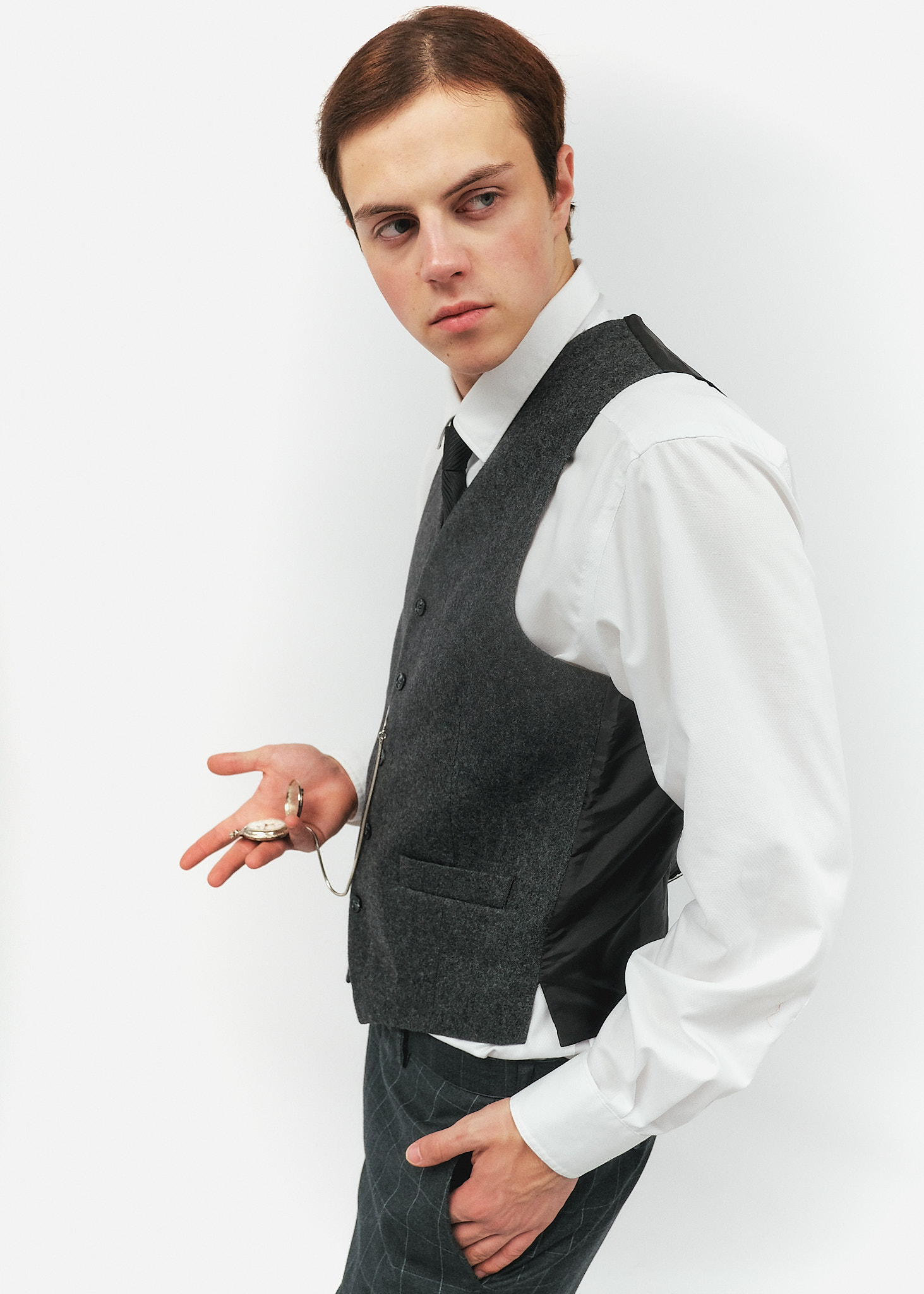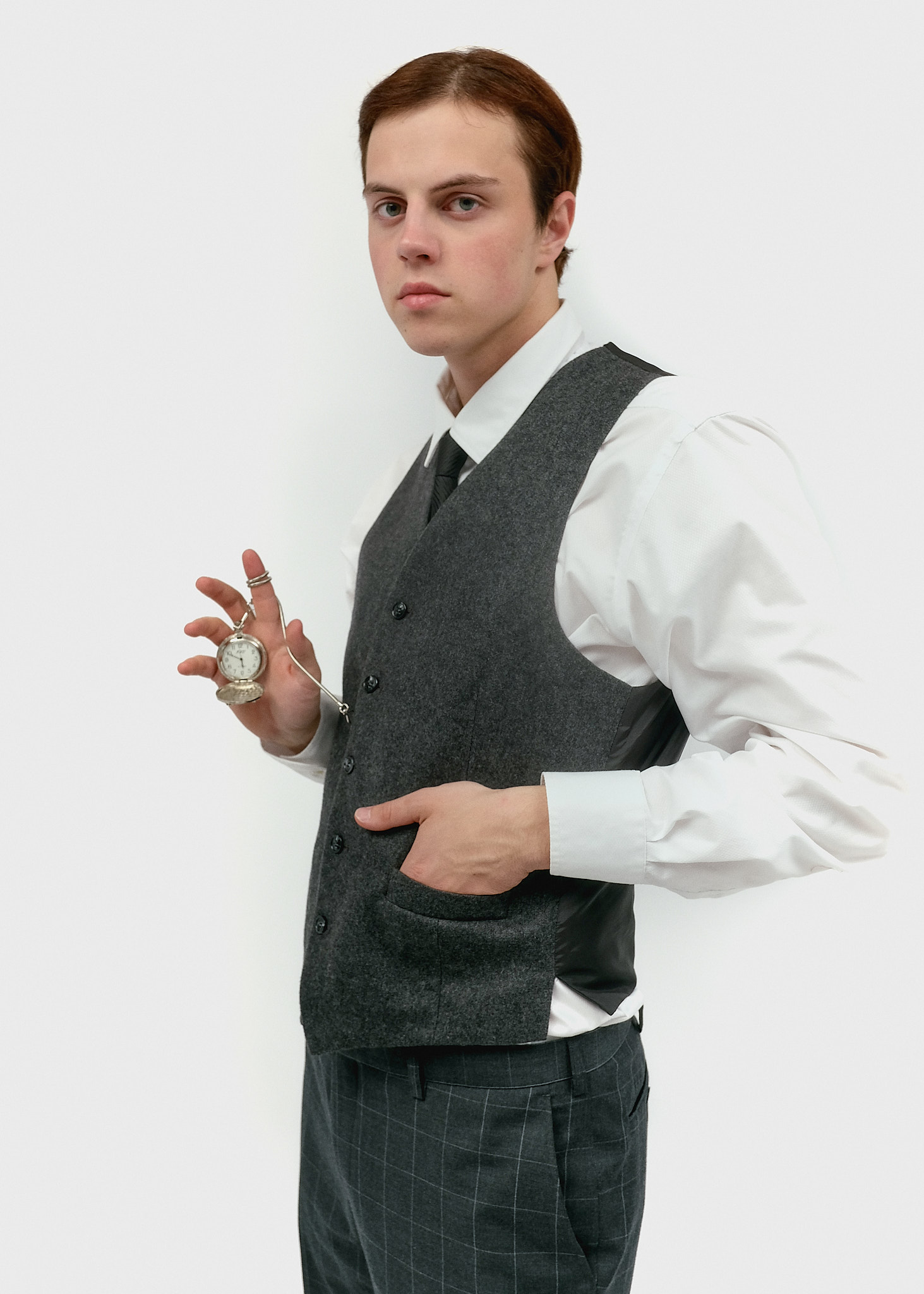 Аксесуар: Кишеньковий годинник на сріблястому ланцюжку, що кріпиться до жилета — ключовий елемент статусу та пунктуальності чоловіка 20-х років.