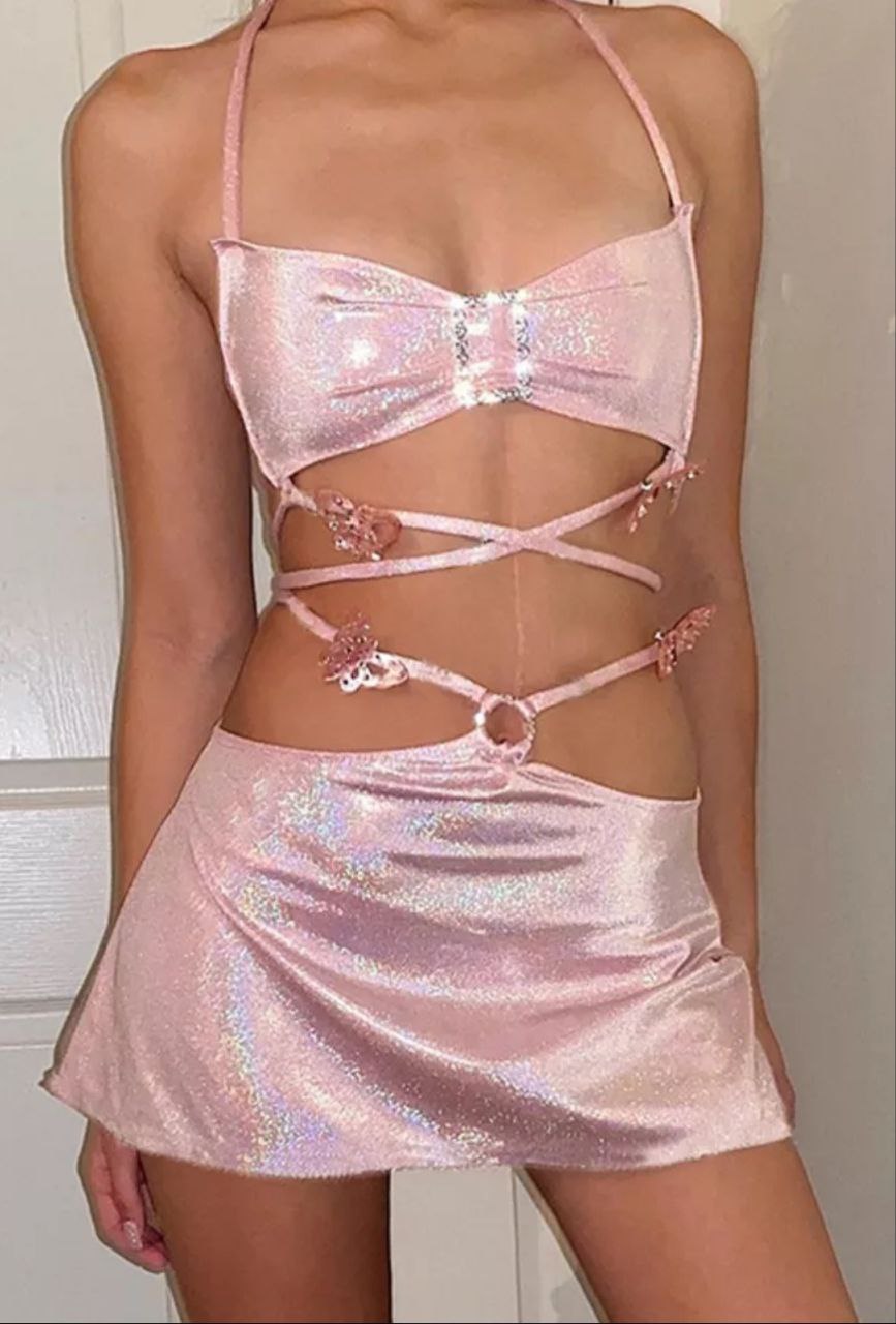 Комплект: Костюм-двійка з ніжно-рожевої тканини з інтенсивним шиммером. Складається з короткого топа-бра на тонких бретелях з відкритою спиною та мініспідниці з низькою посадкою.