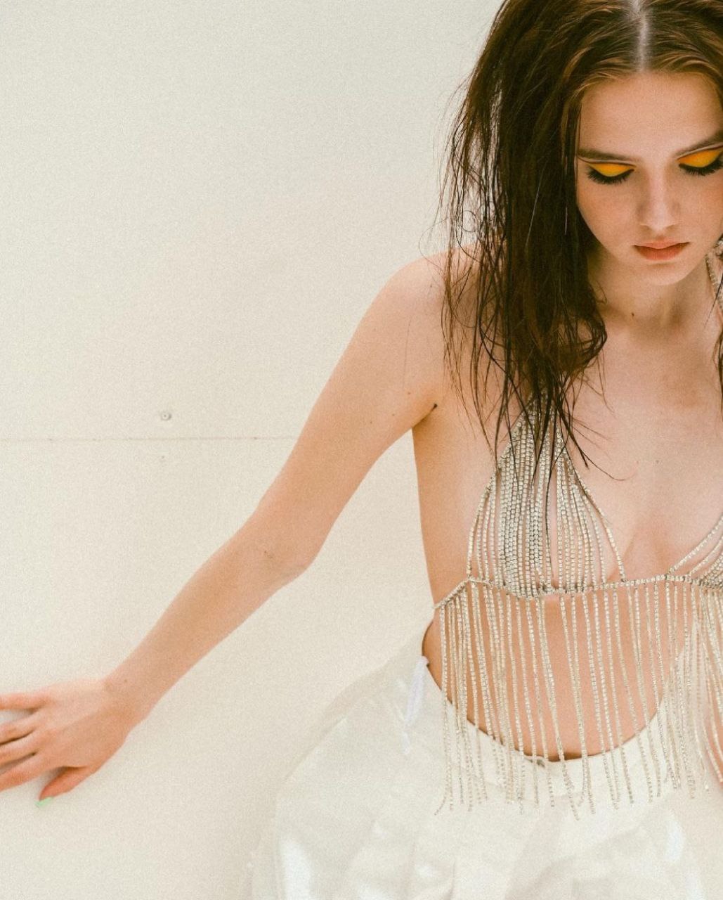 Топ: Ексклюзивний кроп-топ, виконаний з каскадів сріблястих ланцюжків та страз. Тонкі бретелі та довга бахрома створюють ефектний «водоспад», який динамічно грає зі світлом при кожному русі.