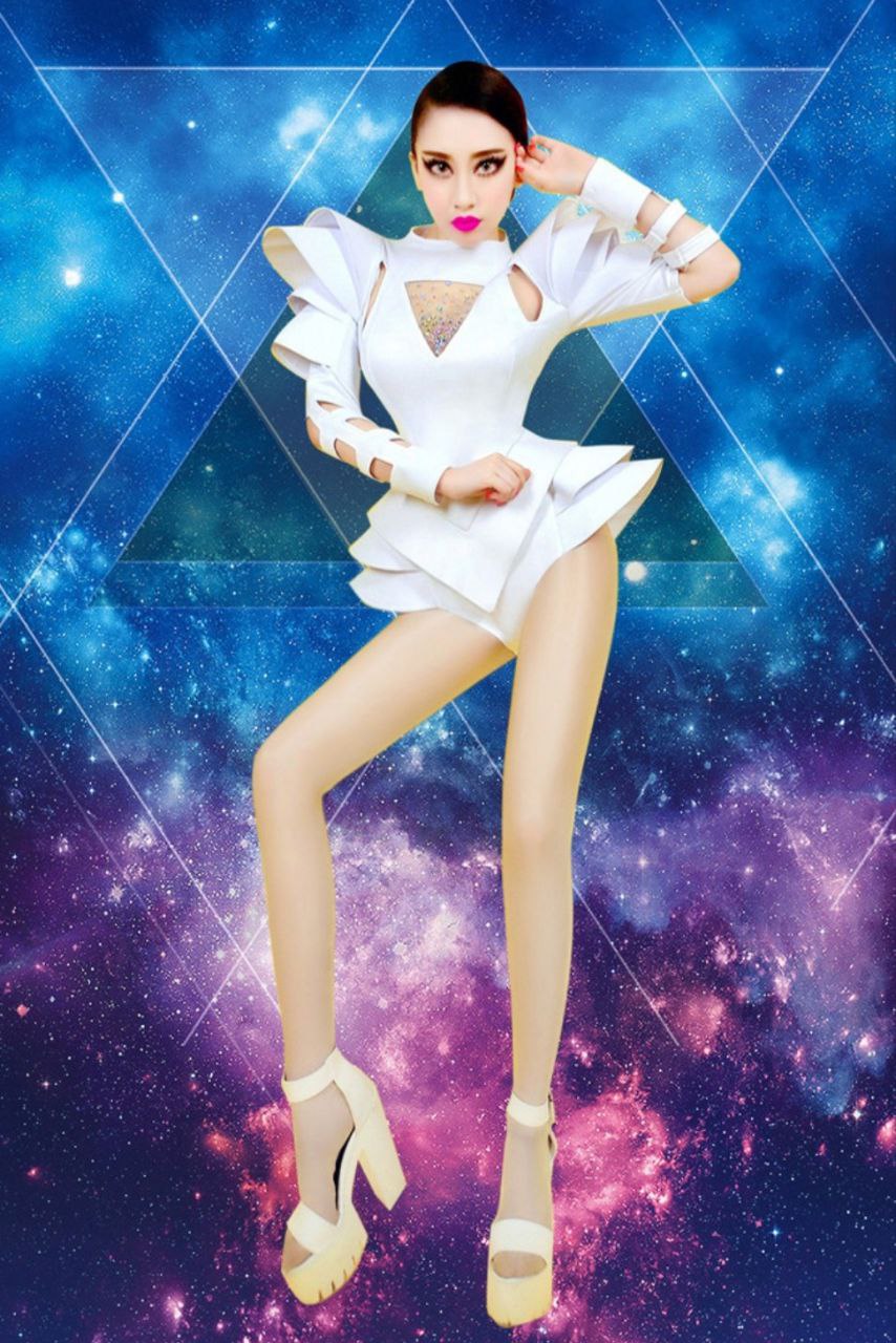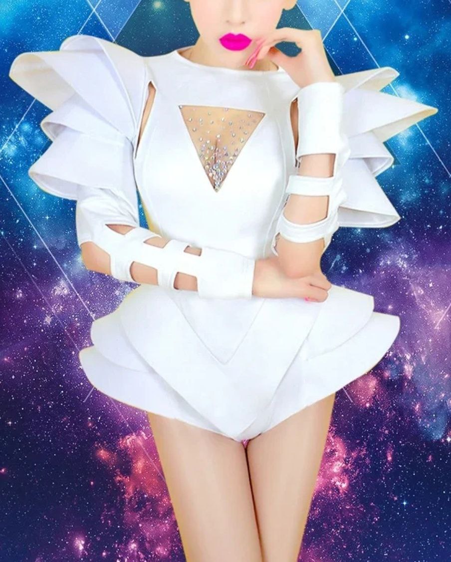Футуристичне боді: Білосніжне боді з жорсткими структурованими воланами на плечах та стегнах. Особливу увагу привертають рукави з декоративними прорізами та трикутне декольте, оздоблене мерехтливими кристалами, що імітують сяйво зірок.