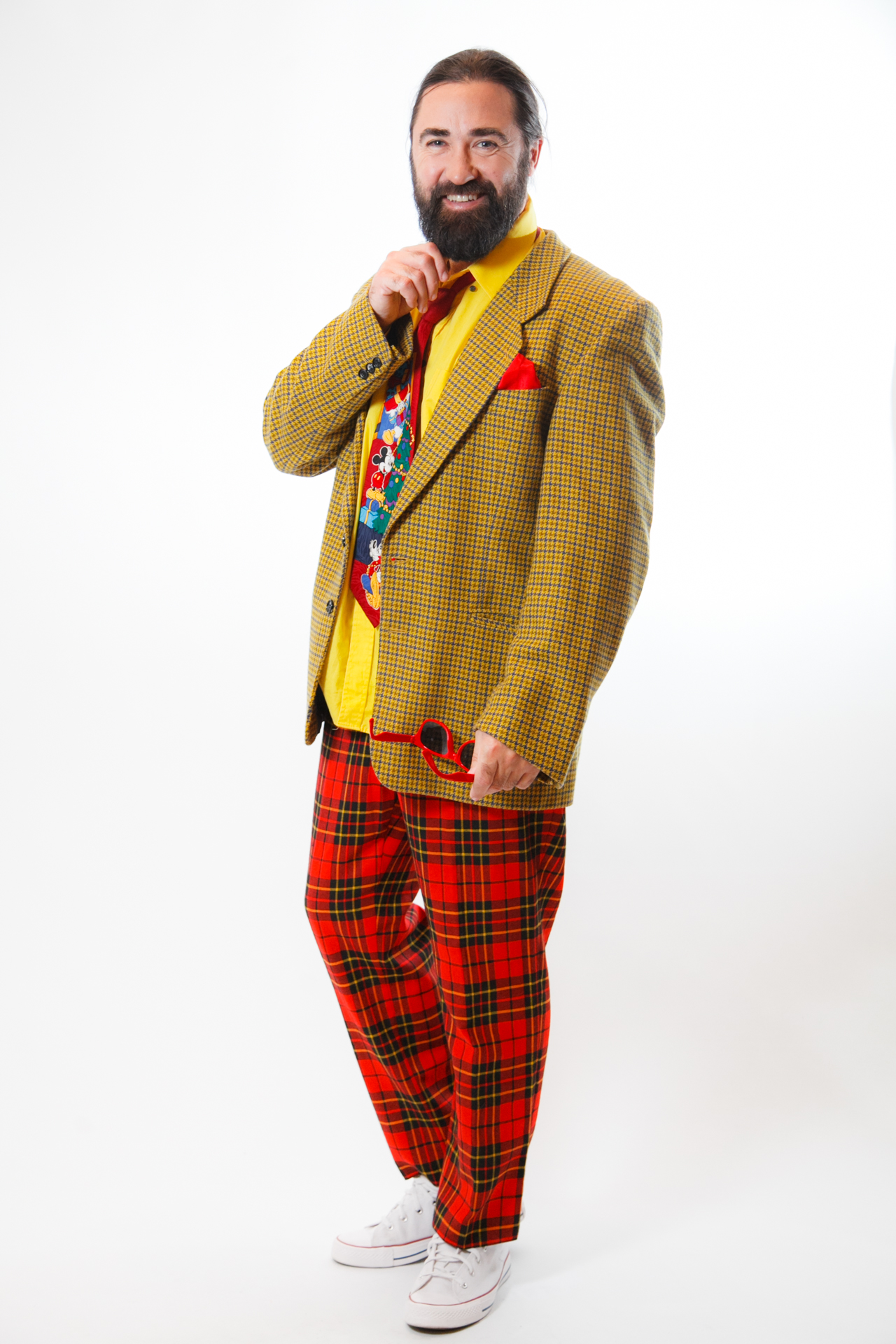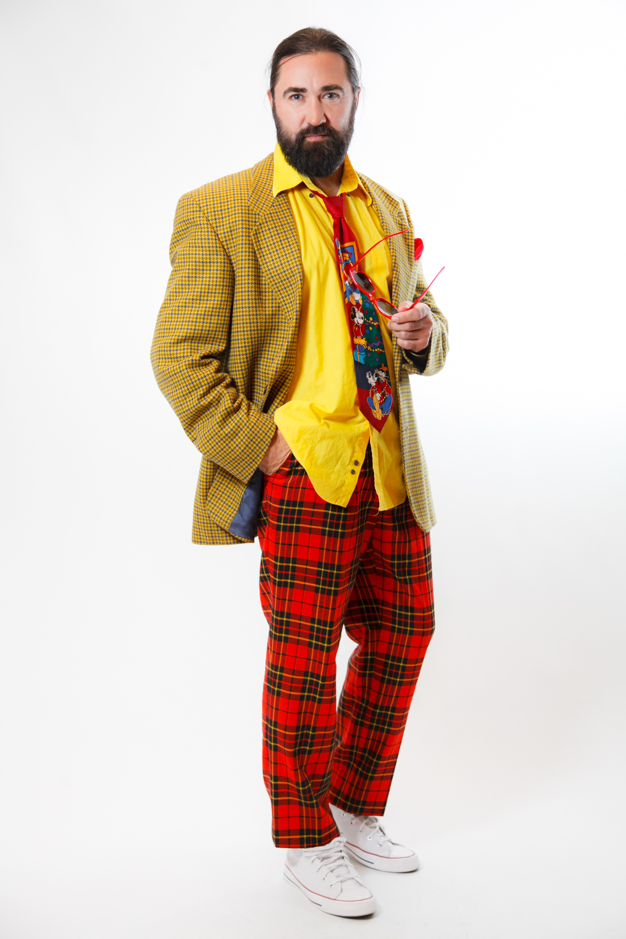 Сорочка та краватка: Яскраво-жовта бавовняна сорочка, поверх якої одягнена широка червона краватка з мультиплікаційним принтом (Міккі Маус), що додає образу грайливості та ретро-ностальгії.