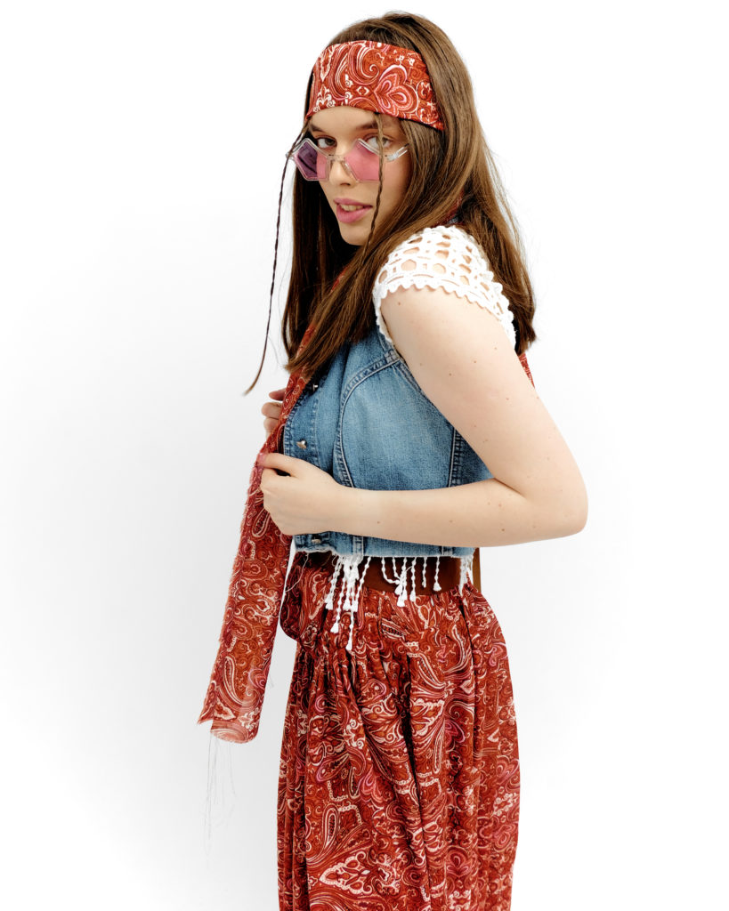 Романтичний та автентичний образ у стилі бохо, що переносить у атмосферу вудстоцького літа. Використання теплої кольорової гами теракотових відтінків у поєднанні з класичним денімом створює гармонійний та водночас виразний візуальний ряд. Легкі тканини та вільний крій підкреслюють дух авантюризму та жіночності.