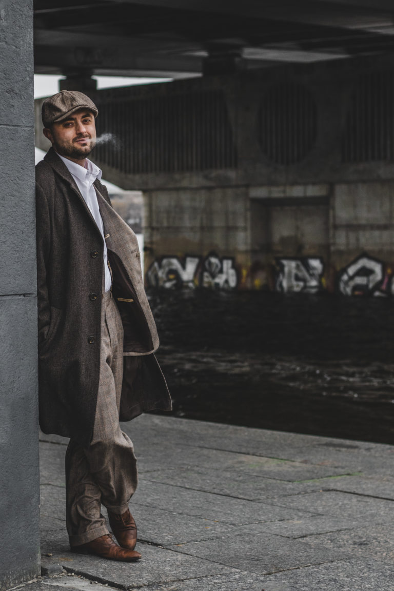 Стриманий та практичний чоловічий образ у стилі «робітничої класи» та вуличного шику 1920-х років. Поєднання грубих фактур твіду та вовни створює образ впевненого чоловіка, натхненний естетикою серіалу «Гострі картузи».