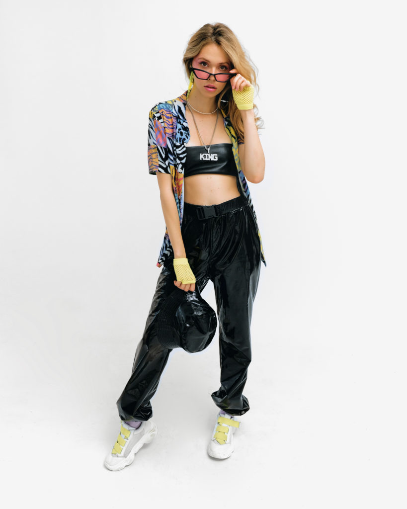 Верх: Коротка сорочка з коротким рукавом, прикрашена хаотичним анімалістичним принтом (тигр та зебра) у неонових блакитних, жовтих та фіолетових відтінках. Під нею — чорний шкіряний топ-бандо з масивним металевим написом «KING» зі стразів.